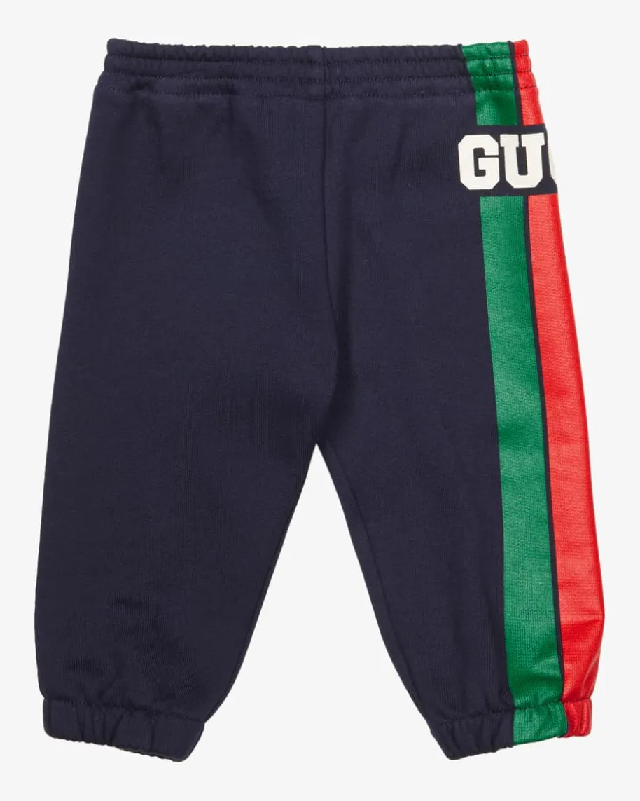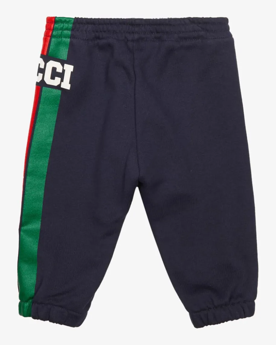 Sweat-Hose für Babys von Gucci Kids in Blau. Das Modell überzeugt mitlabeltypischem Logo-Print sowie den charakteristischen Streifen, die dem Lookeinen sportiven Charakter verleihen. Die weiche Baumwoll-Qualität und dieelastischen Bündchen sorgen für angenehmen Tragekomfort und runden den Lookperfekt ab.