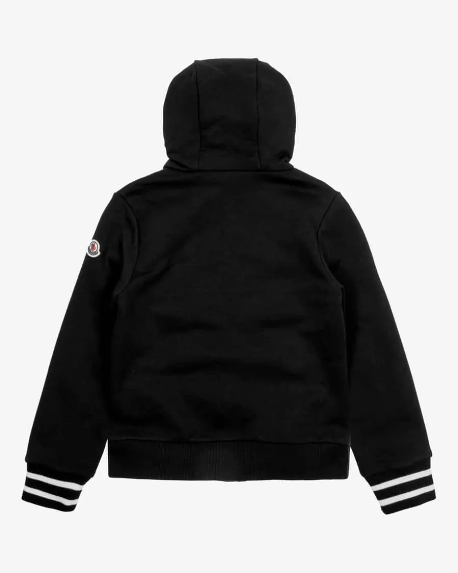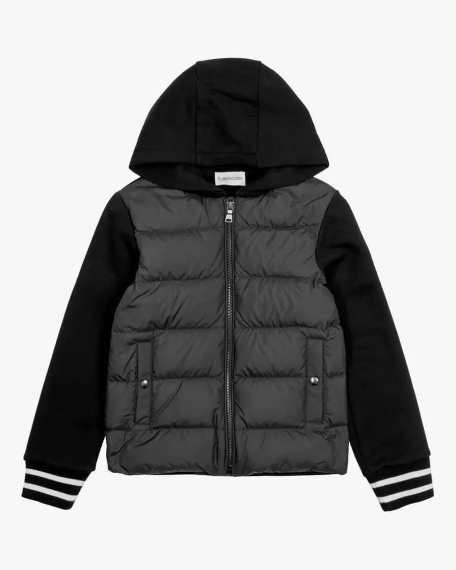 Sweatjacke für Jungen von Moncler Enfant in Schwarz und Weiß. Ein Hybrid-Modellfür sportive Übergangs-Looks – Während die Sweat-Qualität mit flauschigerInnenseite der Jacke einen legeren Charakter verleiht und angenehme Tragemomentebeschert, wärmt die gesteppte Vorderseite mit Daunen-Feder-Füllung auch ankühlen Tagen.