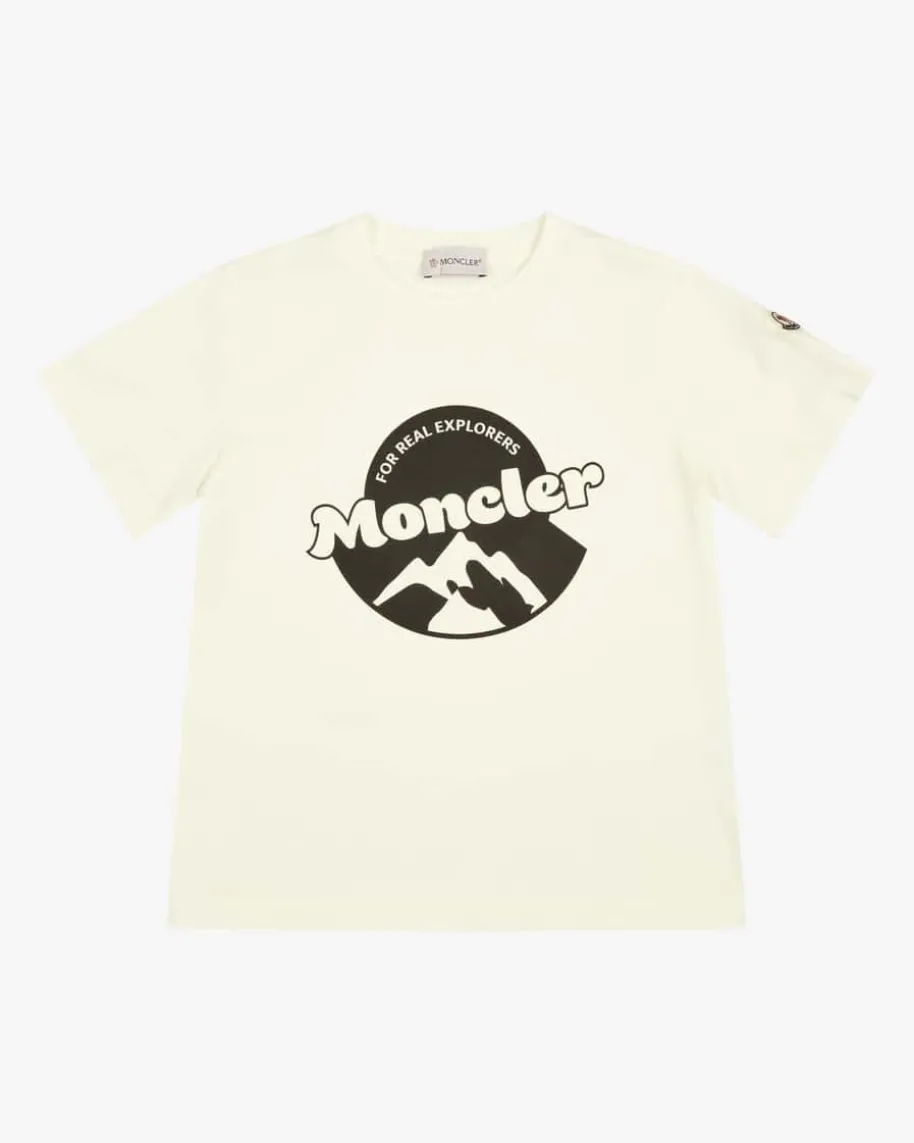 T-Shirt für Jungen von Moncler Enfant in Weiß. Das Modell verspricht dank derweichen Baumwoll-Qualität angenehme Tragemomente, während der Logo-Print einmodisches Gesamtbild kreiert.