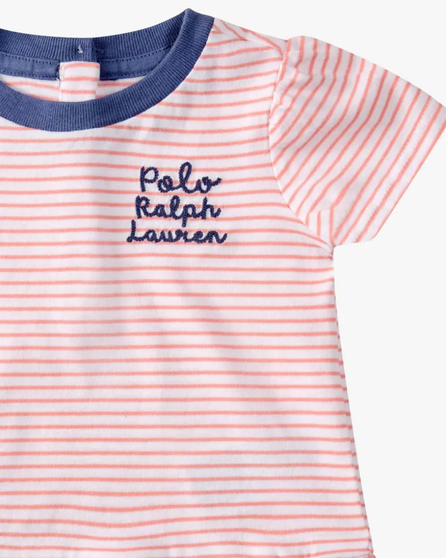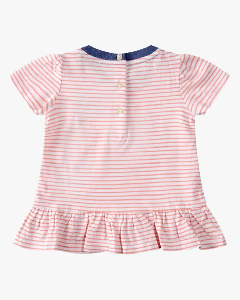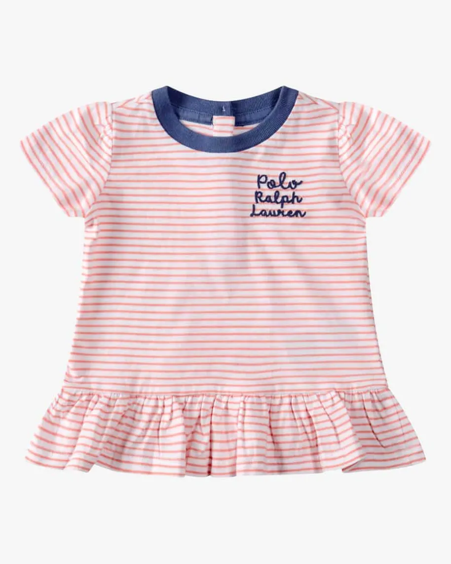 T-Shirt für Babys von Polo Ralph Lauren in Weiß, Altrosa und Blau. Dasausgestellte Modell mit mädchenhaften Volantsaum besticht dank angenehmerJersey-Qualität mit hohem Tragekomfort, während das feine Streifen-Dessin sowiedie kontrastierende Logo-Stickerei einen niedlichen Favoriten für Ihr Kleinesschaffen.