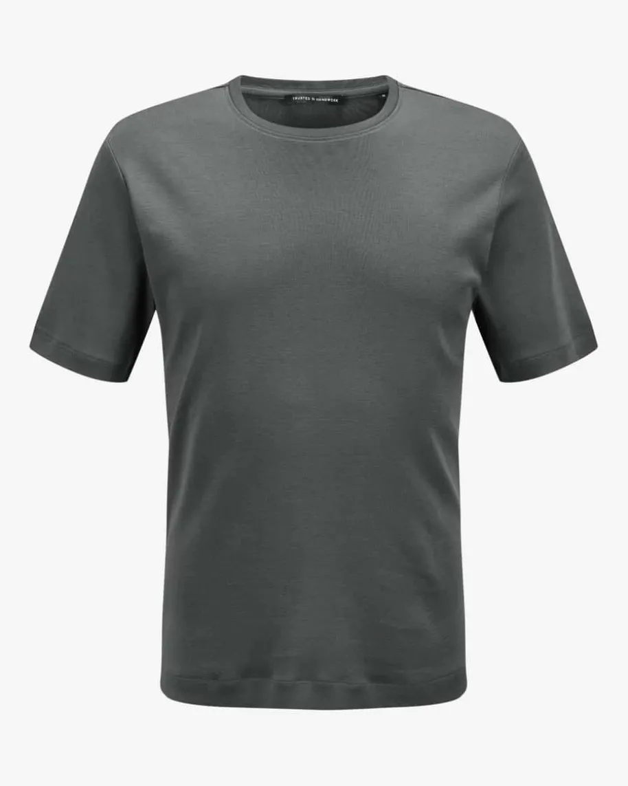 T-Shirt für Herren von Trusted Handwork in Graugrün. Mit Liebe und Leidenschaftdesignt das Label nachhaltig produzierte, handgefertigte Kleidung. Das Modellbegeistert dank der Verwendung von softer Pima-Baumwolle in fein gerippterAufmachung als hochwertiges Basic für vielseitige Casual-Looks.
