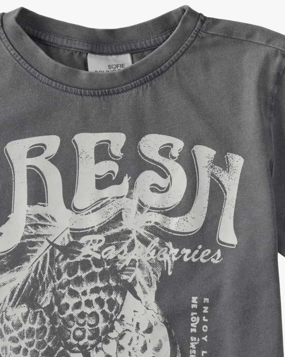 T-Shirt für Mädchen von Sofie Schnoor in Dunkelgrau und Weiß. Das Modell instone-washed Baumwoll-Qualität verspricht angenehme Tragemomente und verleihtzugleich einen dezenten Used-Look, während das Print-Dessin mit modischemErdbeer-Motiv eine legere Note verleiht.
