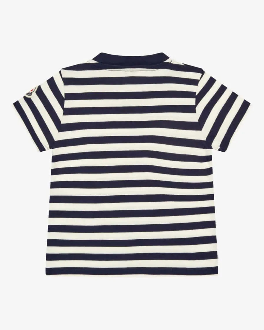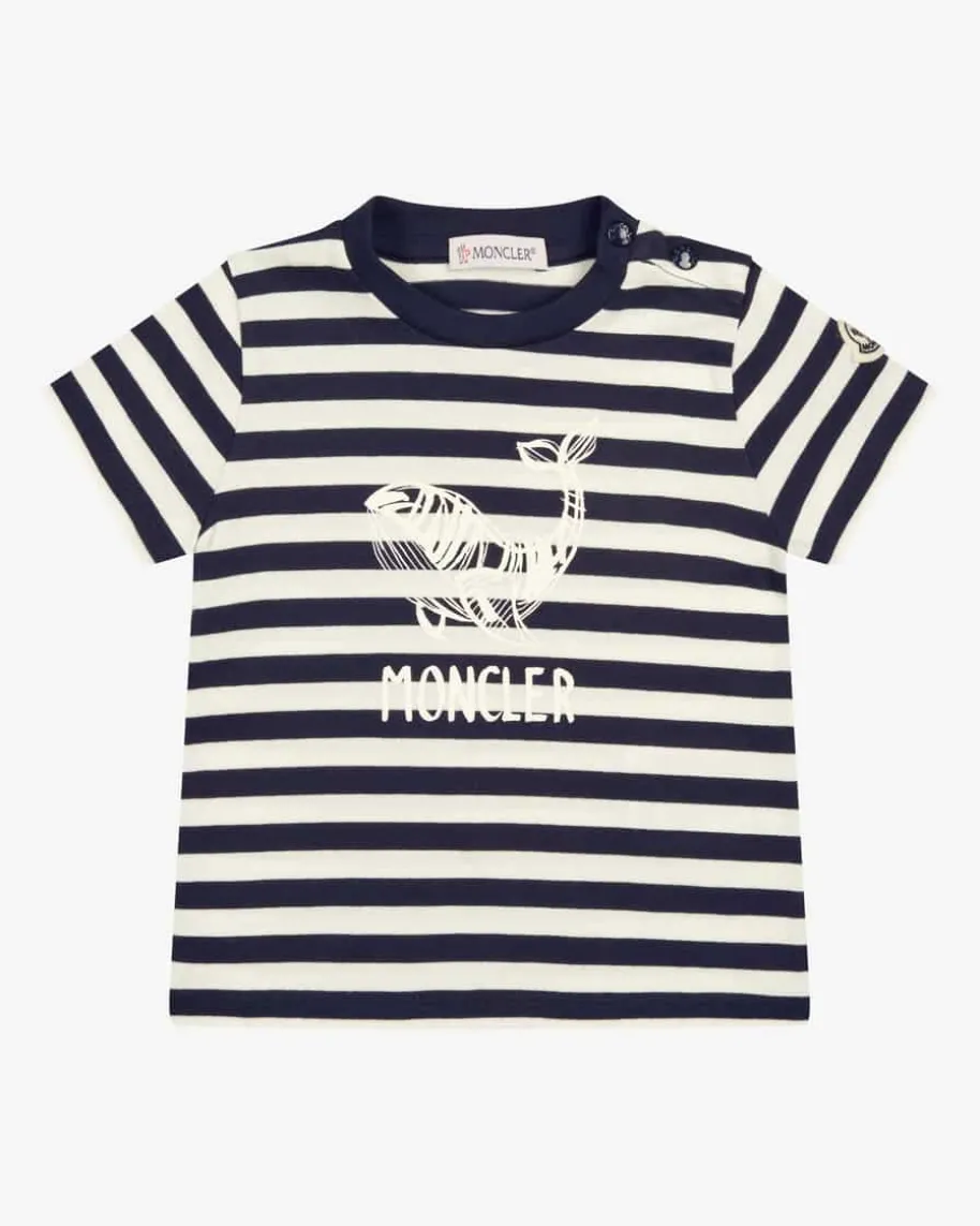T-Shirt für Babys von Moncler Enfant in Navy und Weiß. Das Modell versprichtdank der weichen Baumwoll-Qualität angenehme Tragemomente, während das Streifen-Dessin sowie der Wal-Print ein niedliches Gesamtbild kreieren.