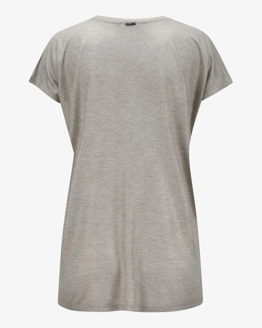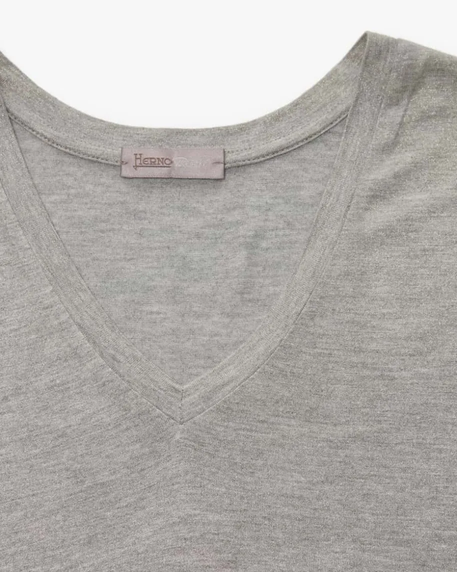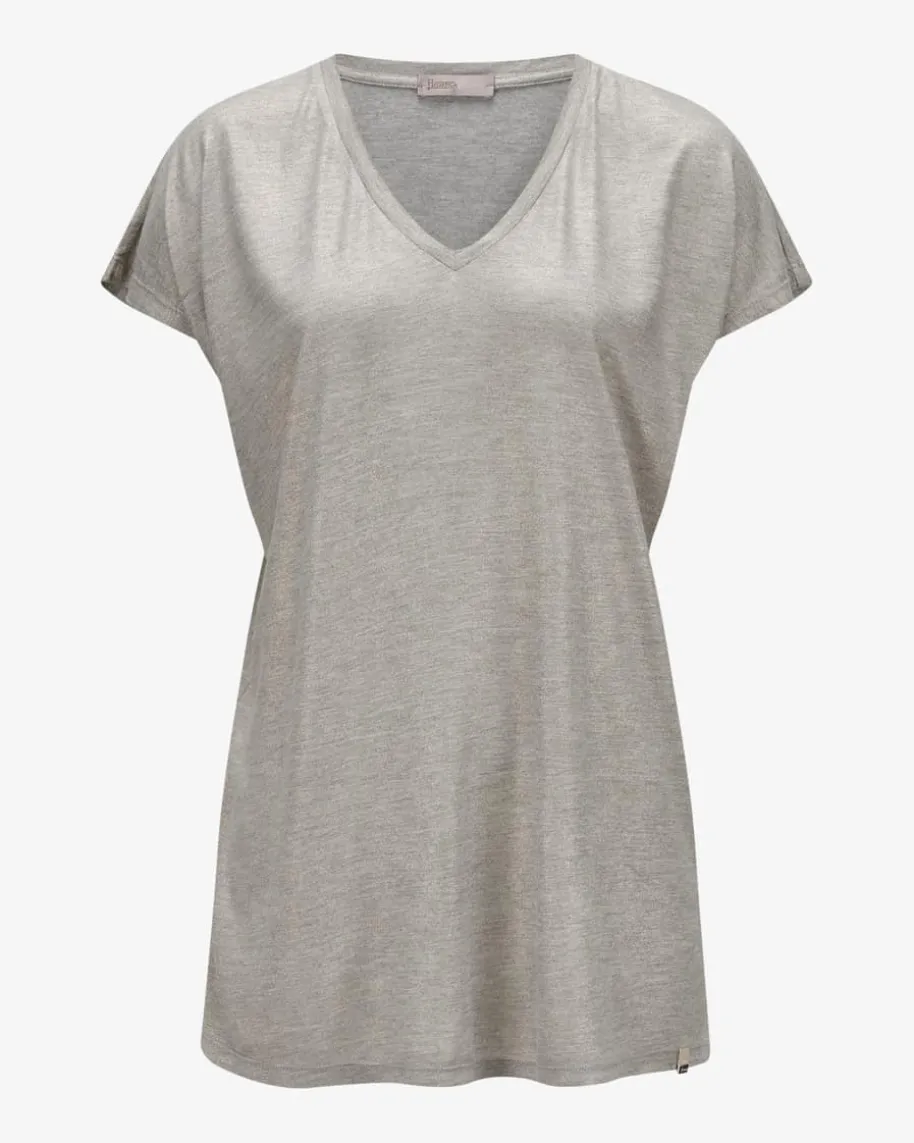 T-Shirt für Damen von Herno in Sand und Gold. Das Modell punktet mit besondersfließender Viskose-Jersey-Qualität, die einen angenehmen Tragekomfortverspricht, während der modische Glitzerprint das Gesamtbild gekonnt abrundet.