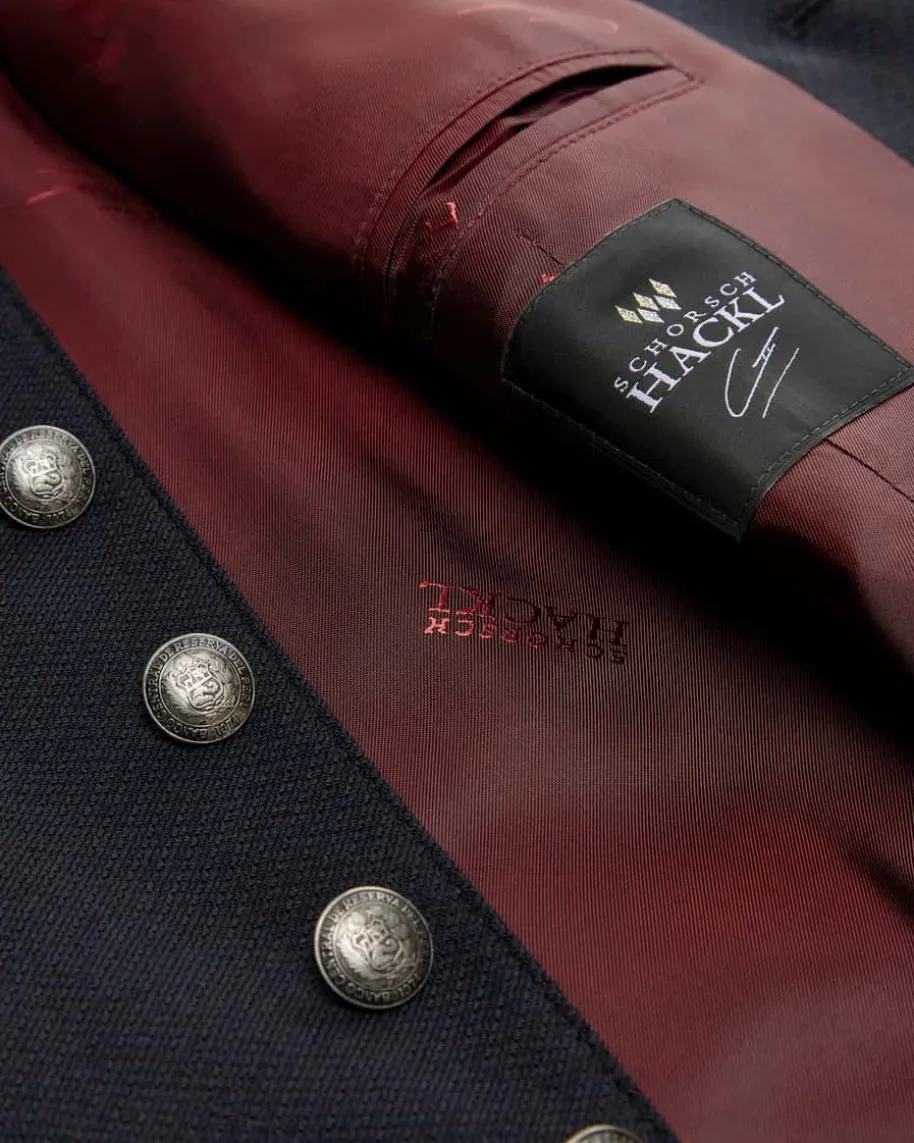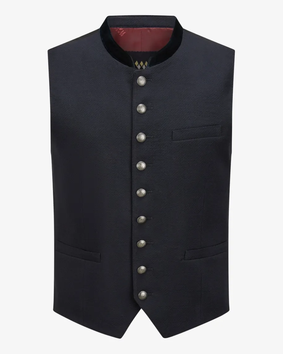 Taching Trachtenweste für Herren von Schorsch Hackl in Nachtblau. Bodenständig,echt, höchste Qualität – diese Eigenschaften verkörpern die Trachten vonSchorsch Hackl. Dieses Modell aus einer leicht strukturierten Qualität bestichtin traditioneller Aufmachung mit changierendem Innenfutter, während diesilberfarbenen Knöpfe stilvolle Akzente setzen.