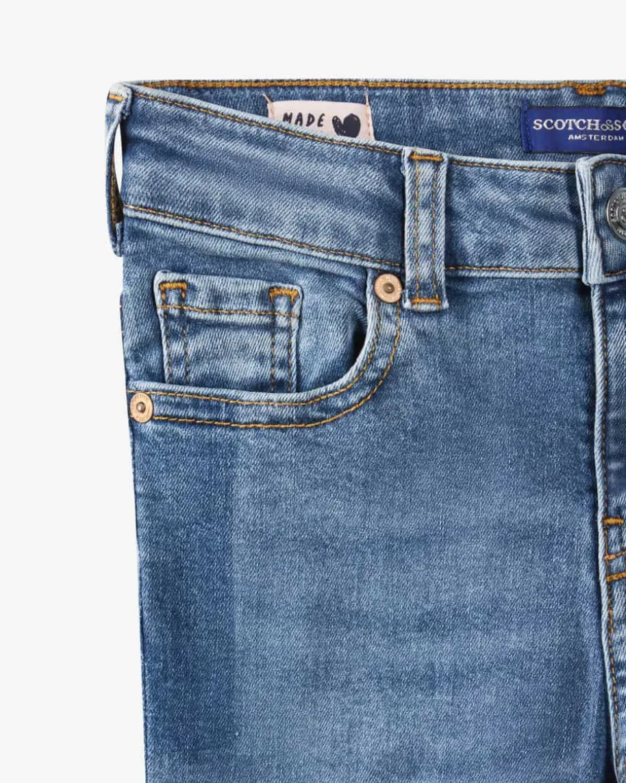 The Charm Jeans High Rise für Mädchen von Scotch & Soda in Blau. Eineausgestellte Schnittführung, die dezente Waschung und Kontrastnähte schaffen einmodisches Gesamtbild, während die elastische Baumwoll-Denim-Verarbeitung einangenehmes Tragegefühl verspricht.