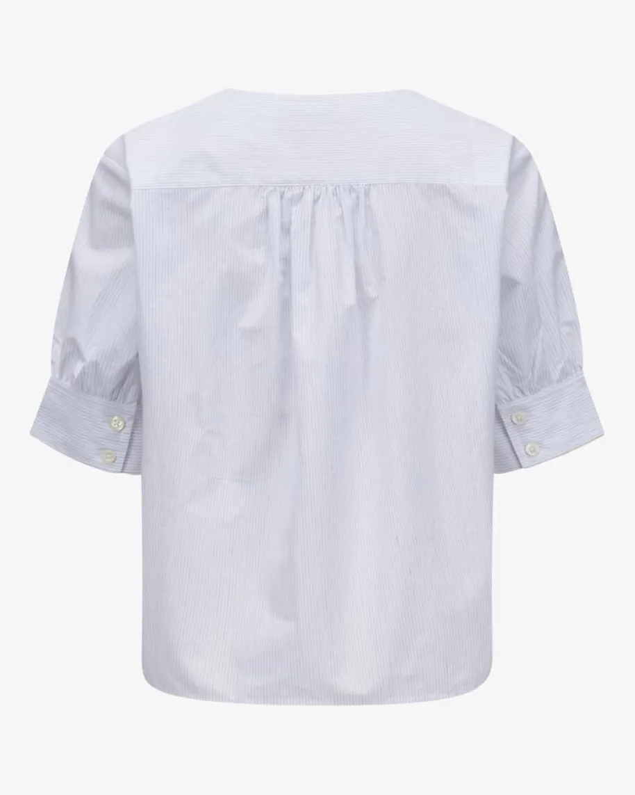 The V Neck Bluse für Damen von Frame in Weiß und Blaugrau. Das Modellpräsentiert sich in hochwertiger Baumwoll-Leinen-Qualität welche für angenehmeTragemomente sorgt, während das feine Streifenmuster in Kombination mitklassischen Details einen sommerlichen Begleiter kreiert der sich vielseitigstylen lässt.