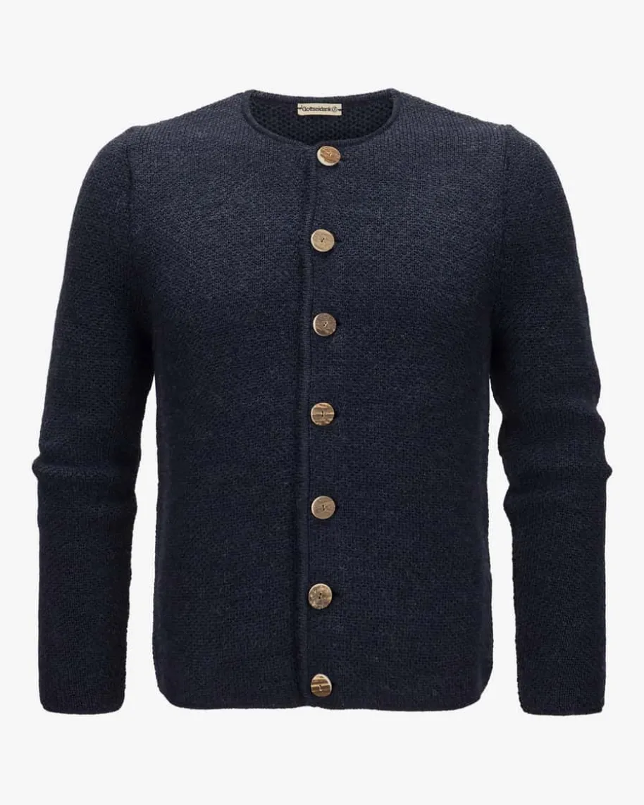 Toni Trachten-Strickjacke für Herren von Gottseidank in Nachtblau. Tracht mitCharakter – Traditionelle Details, ein einzigartiges Strickmuster sowiehochwertige Schurwoll-Verarbeitung zeichnen das Modell des Münchner Labelsgekonnt aus.