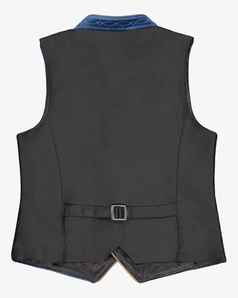Toni Jungen-Trachtenweste von Hammerschmid in Blau und Schwarz. Klassischgeschnitten und mit verstellbarem Taillenriegel auf der kontrastierendenRückseite versehen, überzeugt die Weste durch die edle Samtpartie auf derVorderseite.