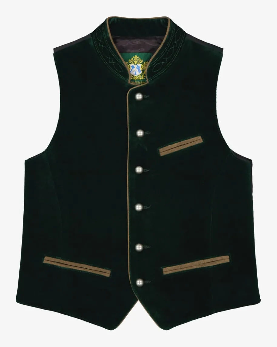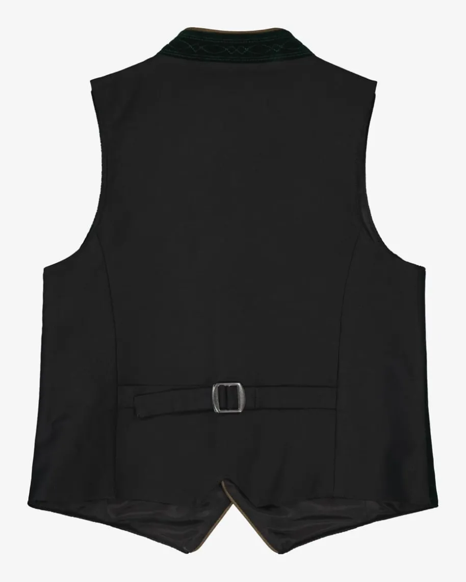 Toni Trachtenweste für Jungen von Hammerschmid in Dunkelgrün und Schwarz.Klassischgeschnitten und mit verstellbarem Taillenriegel auf der kontrastierendenRückseite versehen, überzeugt die Weste durch die edle Samtpartie auf derVorderseite.
