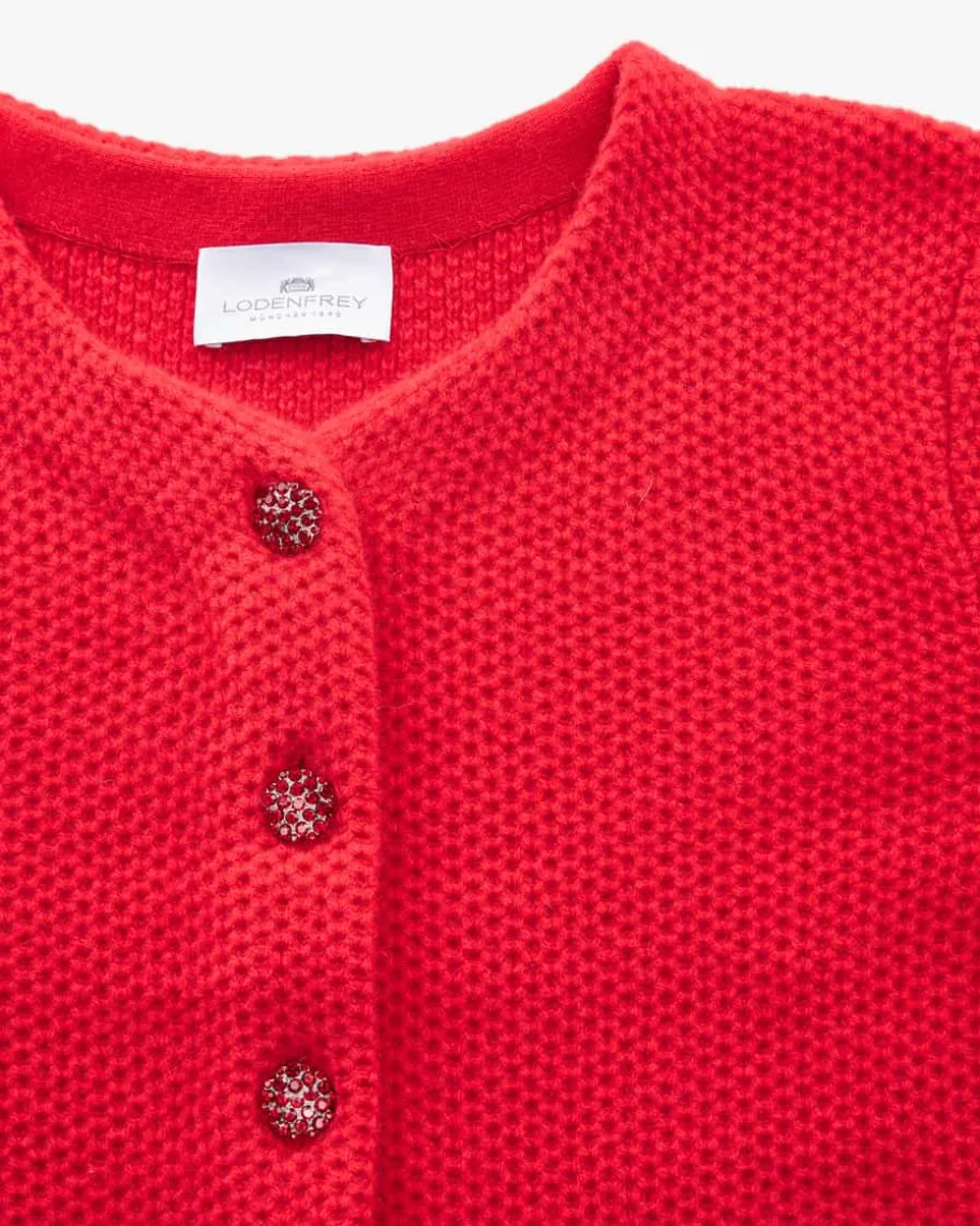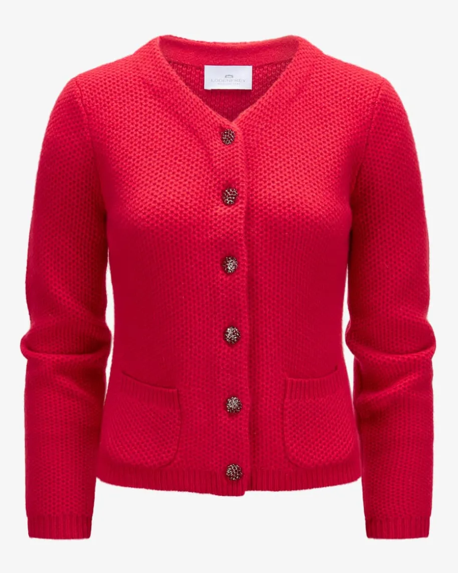 Trachten-Cashmere-Strickjacke für Damen von LODENFREY München 1842 in Rot.Tradition und Moderne in perfektem Zusammenspiel – Das Modell begeistert durchdie klassische Linksstrick-Qualität, während edle Schmuckstein-Knöpfe denTrachten-Look charmant abrunden.