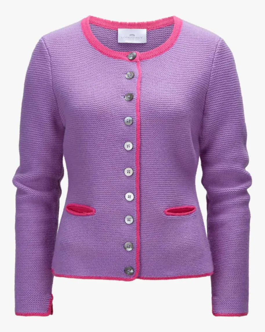 Trachten-Cashmere-Strickjacke für Damen von LODENFREY München 1842 in Violettund Pink. Tradition und Moderne in perfektem Zusammenspiel – Die edleLinksstrick-Jackepräsentiert sich in traditioneller Aufmachung, während die edle QualitätTrachten-Looks harmonisch abrundet.