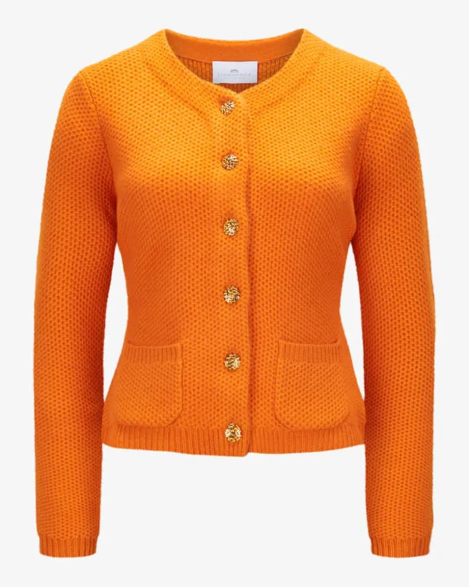 Trachten-Cashmere-Strickjacke für Damen von LODENFREY München 1842 in Orange.Tradition und Moderne in perfektem Zusammenspiel – Das Modellbegeistert durch die klassische Linksstrick-Qualität, während Schmuckstein-Knöpfe den Trachten-Look charmant abrunden.