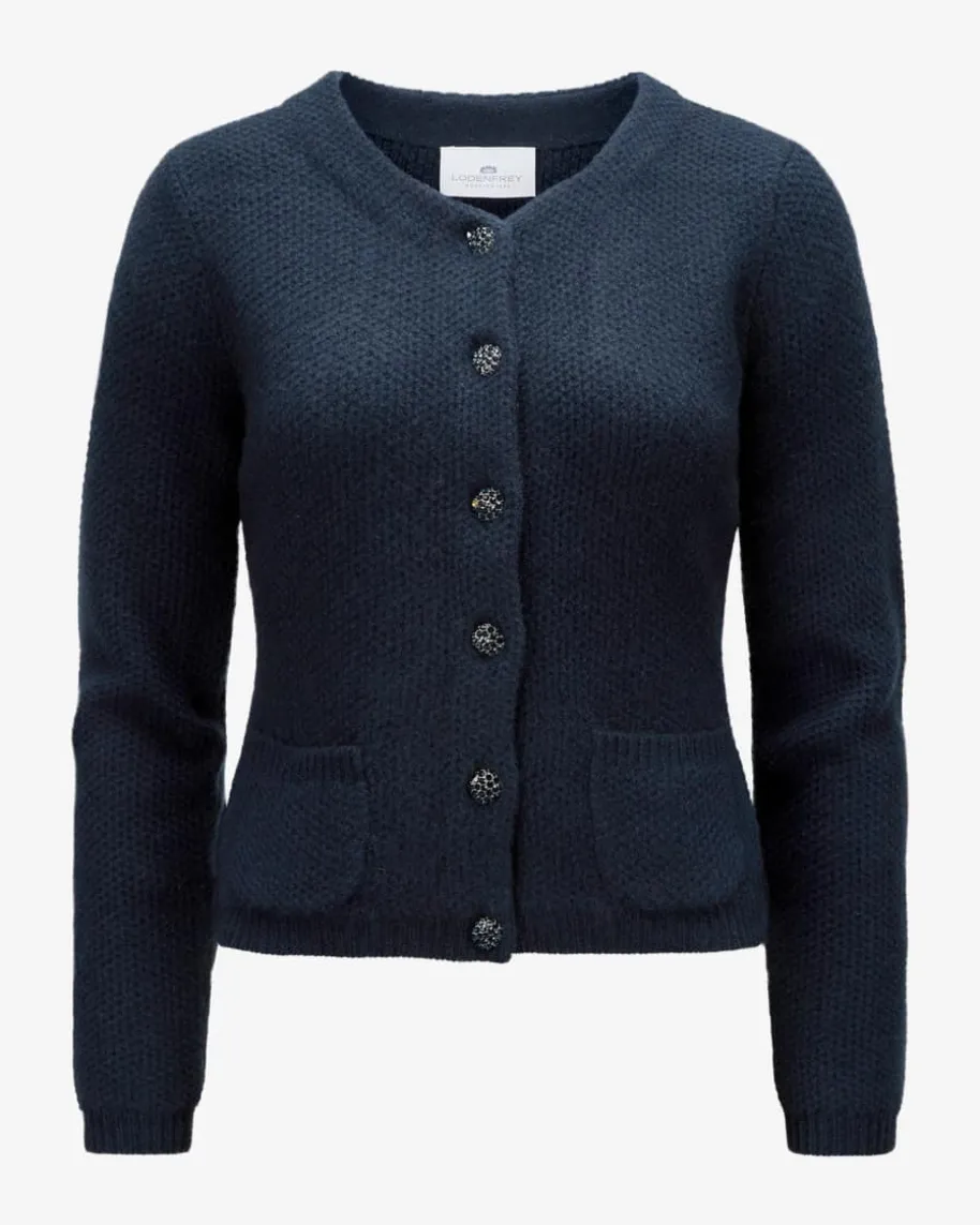 Trachten-Cashmere-Strickjacke für Damen von LODENFREY München 1842 in Navy.Tradition und Moderne in perfektem Zusammenspiel – Das Modellbegeistert durch die klassische Linksstrick-Qualität, während Schmuckstein-Knöpfe den Trachten-Look charmant abrunden.