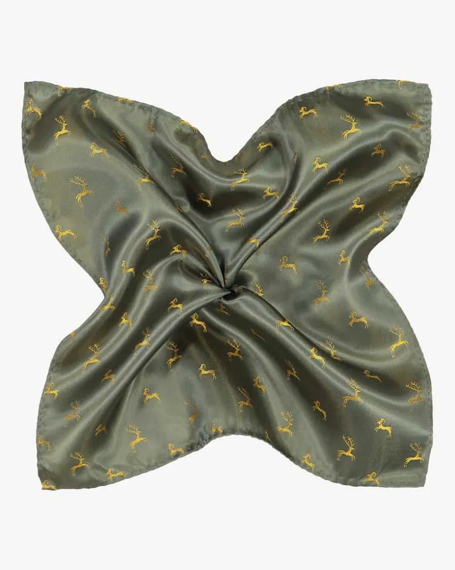 Trachten-Einstecktuch für Herren von Poldi in Oliv und Gelb. ErstklassigeVerarbeitung und ein traditionelles Design mit Hirschen zeichnen das Modell aus.Die Verwendung von hochwertiger Seide verleiht zudem einen dezenten Glanz.