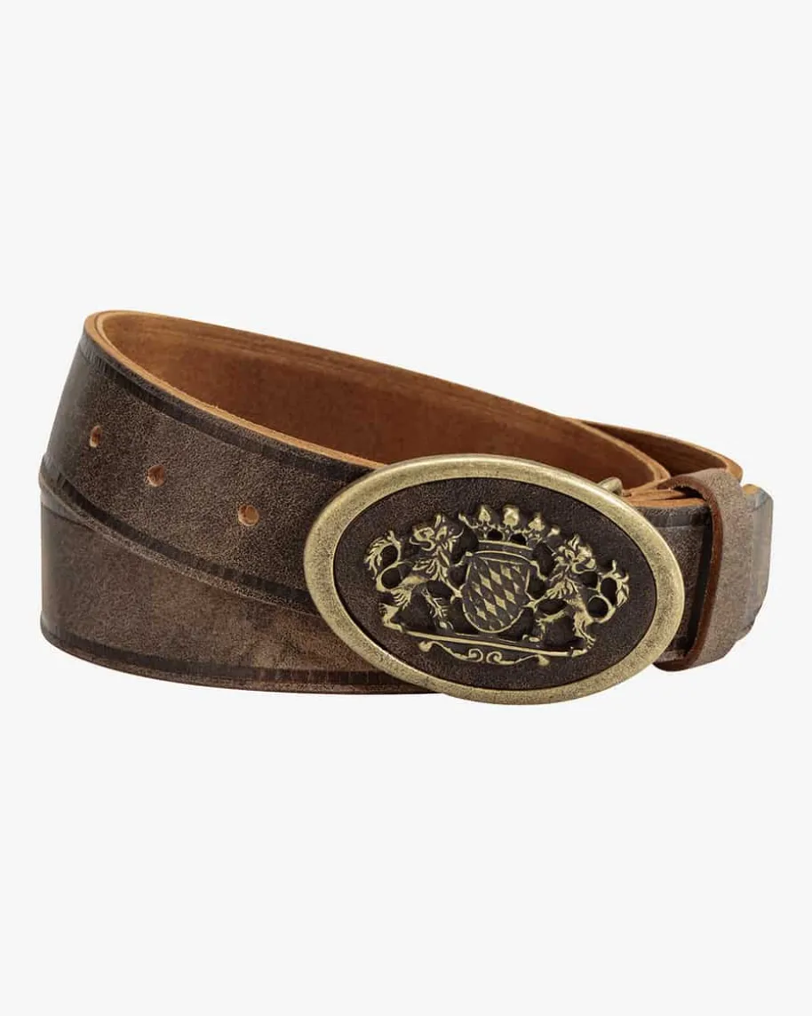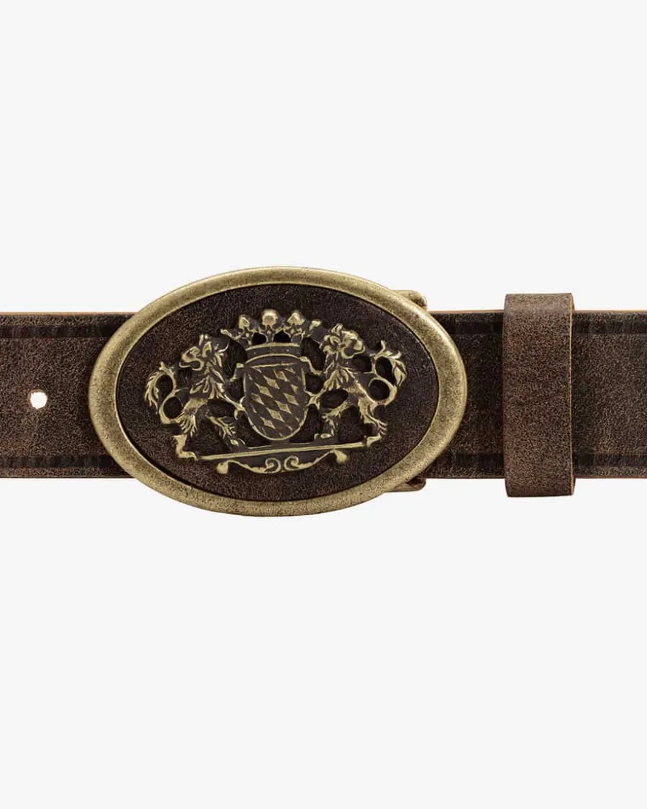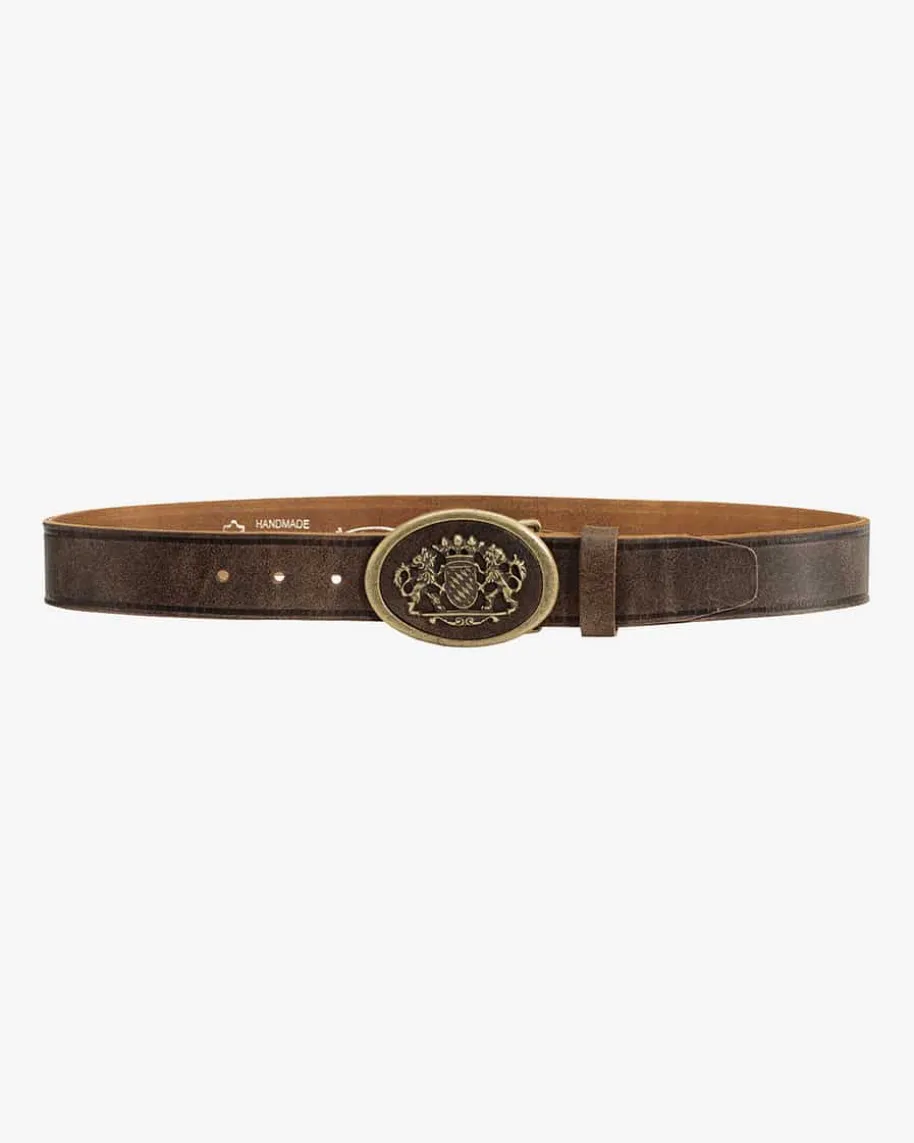 Trachten-Gürtel für Herren von Töpfer in Braun. Handgefertigt in Bayern und in edlem Leder präsentiert sich der rustikale Gürtel. Eine traditionelle Note verleiht die dekorative Motiv-Schließe. Vollendet wird das Modell durch die Antik-Prägung des Leders sowie die zwei Kontrast-Paspeln.