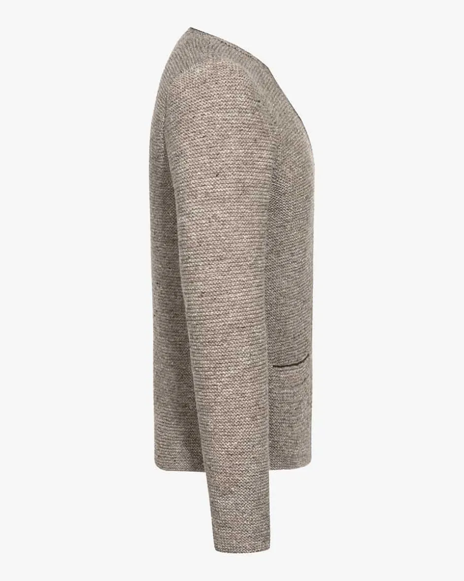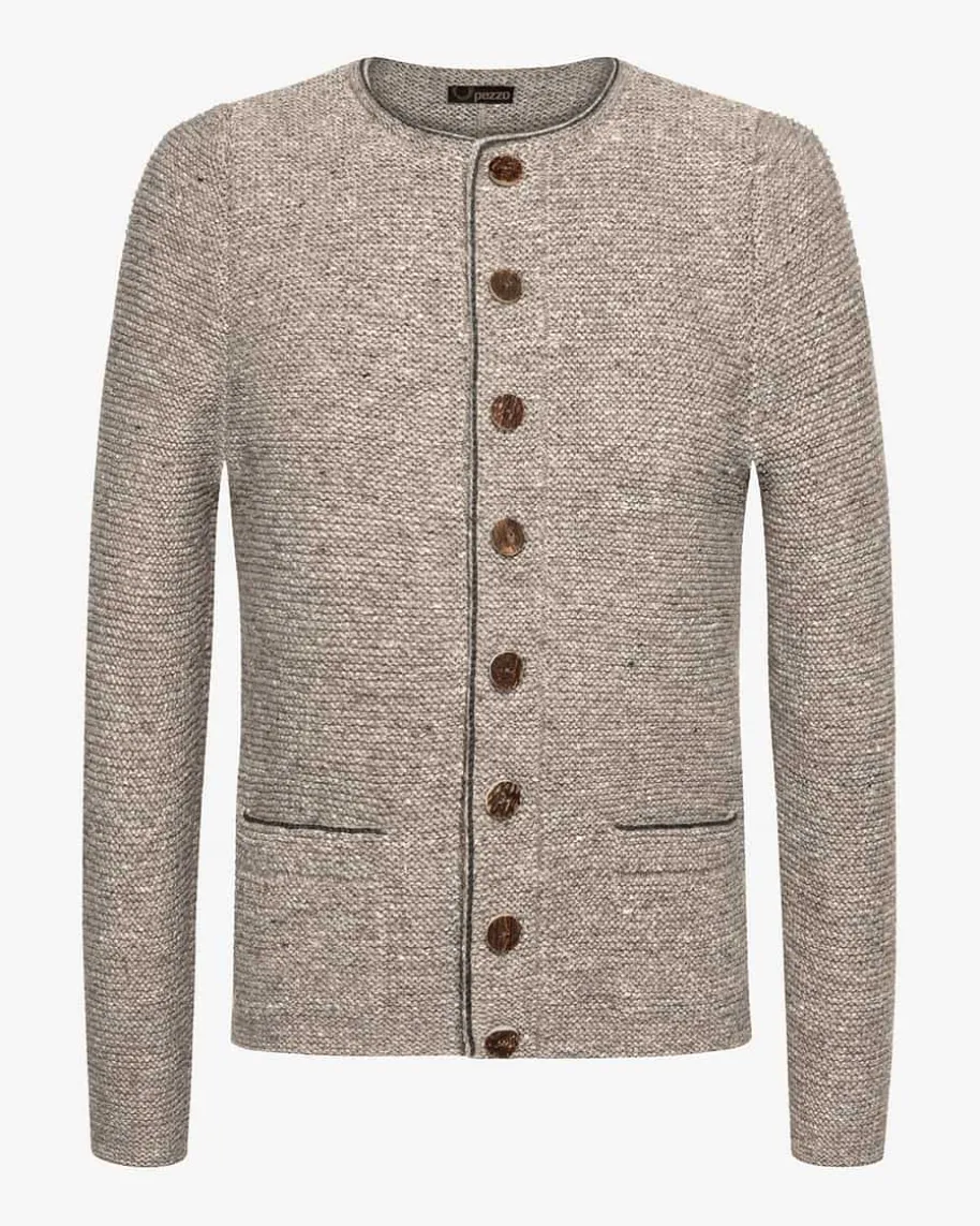 Trachten-Handstrickjacke für Herren von Pezzo in Beige. DieStrickjacke aus angenehmer Schurwolle präsentiert sich intraditionellerAufmachung. Kontrastierende Paspelierungen am Rundhals-Ausschnitt, an derdurchgehenden Knopfleiste sowie an den zwei Taschenverleihen eine besondereNote, während echte Hornknöpfe das rustikale Gesamtbildgekonnt abrunden.