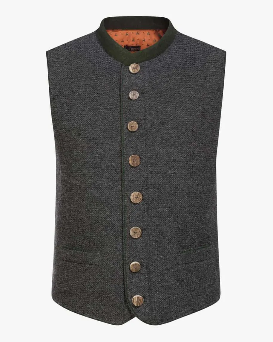Trachten-Handstrickweste für Herren von Pezzo in Grau undDunkelgrün. Die Strickweste aus Schurwolle besticht durchhochwertigeVerarbeitung und eine traditionelle Aufmachung, während diekontrastierendeRückseite sowie echte Hornknöpfe die Weste zum edlenTrachten-Highlight machen.