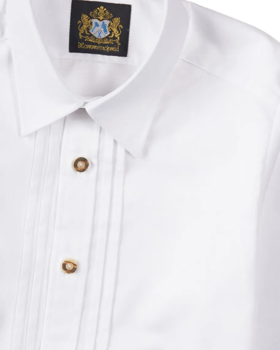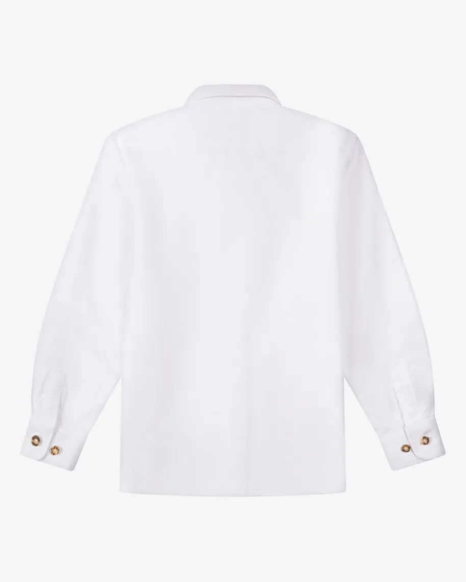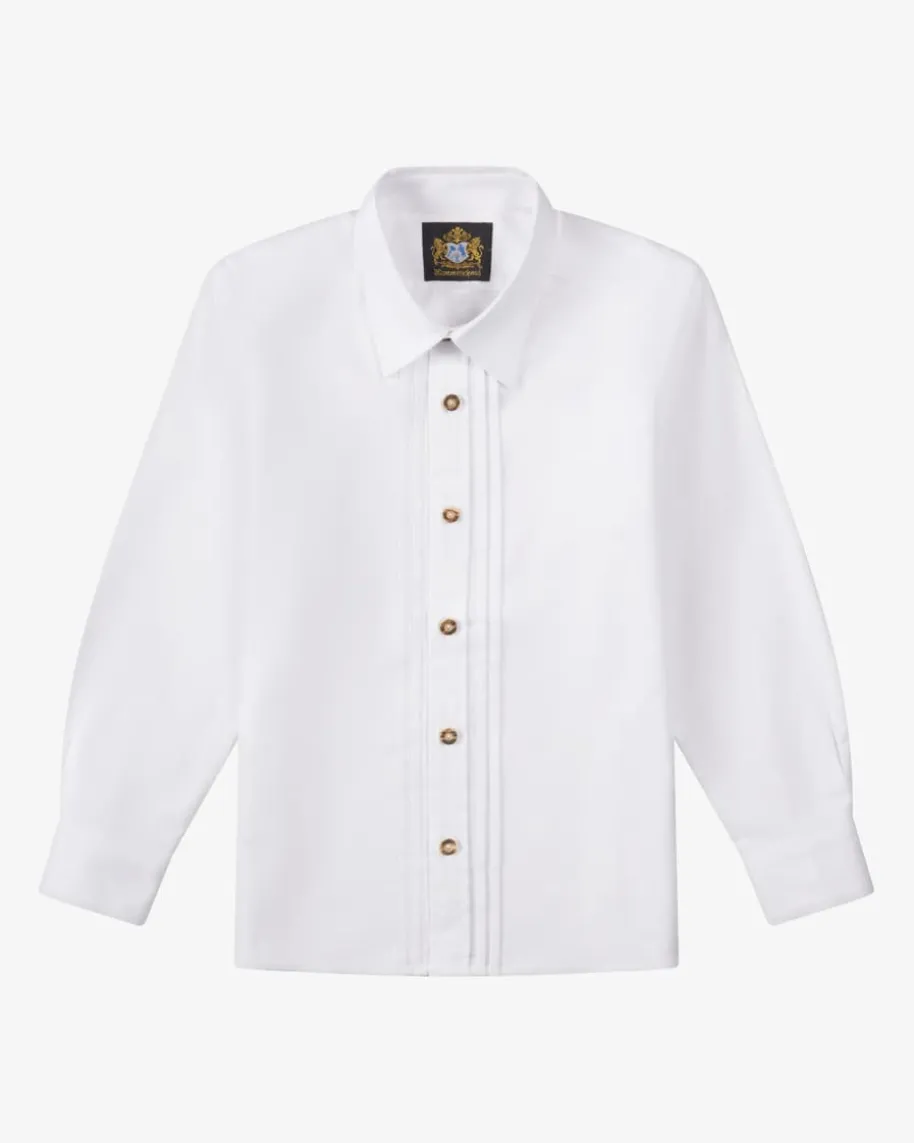Trachten-Hemd für Kinder von Hammerschmid in Weiß. Das traditionelle Hemd ausangenehmer Baumwolle überzeugt dank klassischem Umlegekragen und Hirschhorn-Knöpfen als stilvoller Blickfang für modische Mini-Trachten-Outfits.