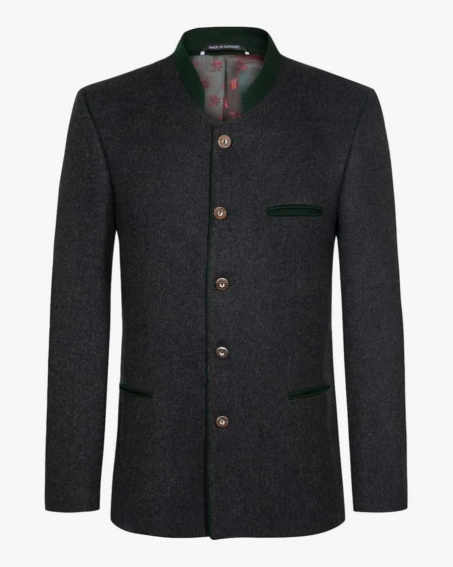 Trachten-Janker für Herren von Sandberg in Anthrazit. Zeitlose Elemente und traditionelles Design verbinden sich in diesem exklusiv für LODENFREY entworfenen Janker. Der gerade Schnitt mit Kellerfalte und Zierriegel auf der Rückseite bietet zusammen mit hochwertiger Schurwolle einen hohen Tragekomfort, während eine leichte Schulterwattierung für eine perfekte Passform sorgt. Moosgrüne Paspelierungen an Stehkragen, Taschen, Manschetten und Knopfleiste verleihen eine elegante Note. Hornknöpfe runden den Trachten-Look gekonnt ab.