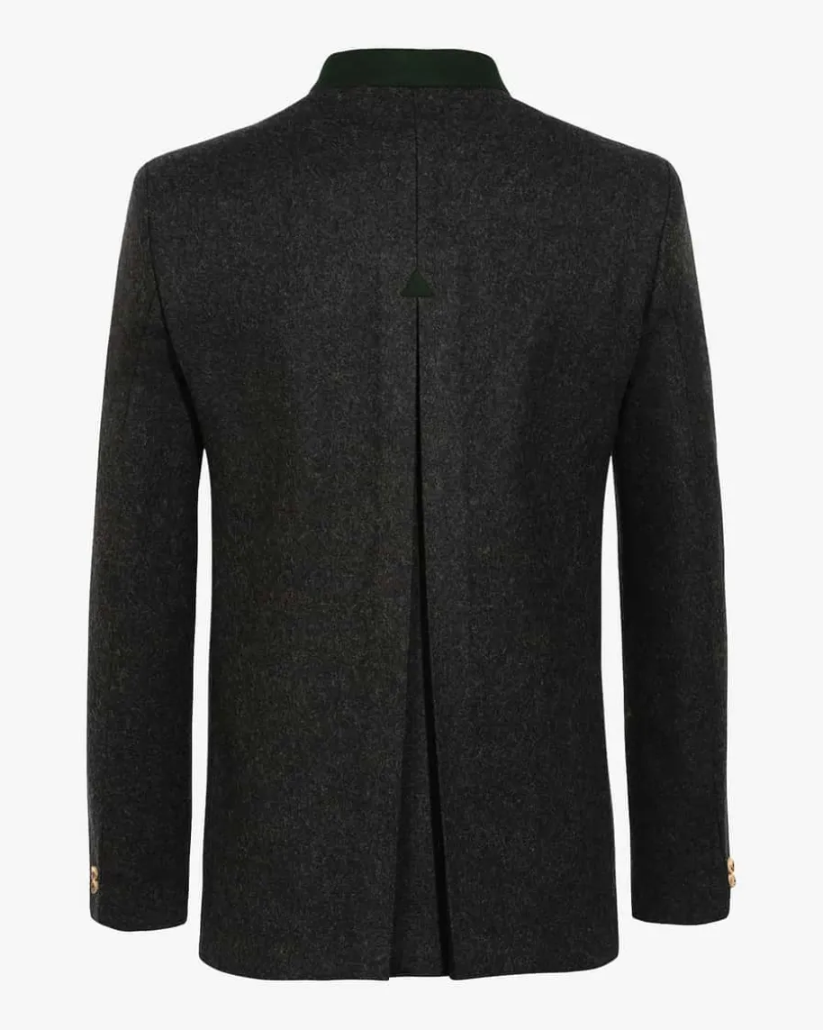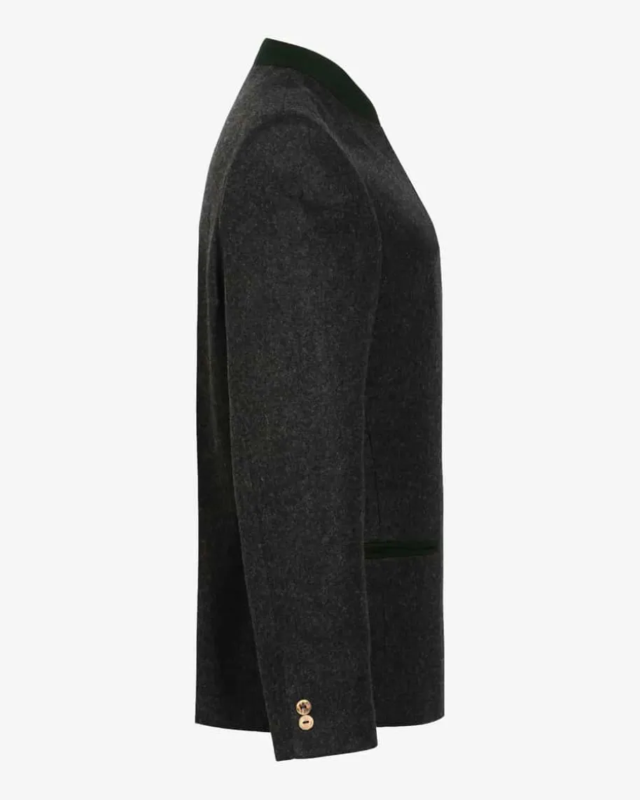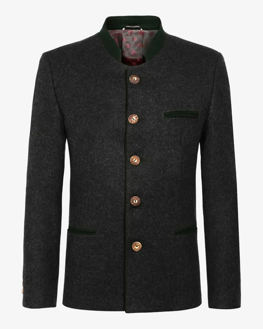 Trachten-Janker für Herren von Sandberg in Anthrazit. Derexklusiv für LODENFREY entworfene Janker aus hochwertigem,bayerischem Loden wird durch grüne Paspeln an den dreiPaspeltaschen, der Verschluss-Leiste und dem Stehkragen inSzene gesetzt. Hornknöpfe aus edlem Hirschhorn verleiheneine rustikale Note, während eine leichte Schulterwattierungund eine Kellerfalte die klassische Silhouette mit zweiInnentaschen und changierendem Futter vollenden.