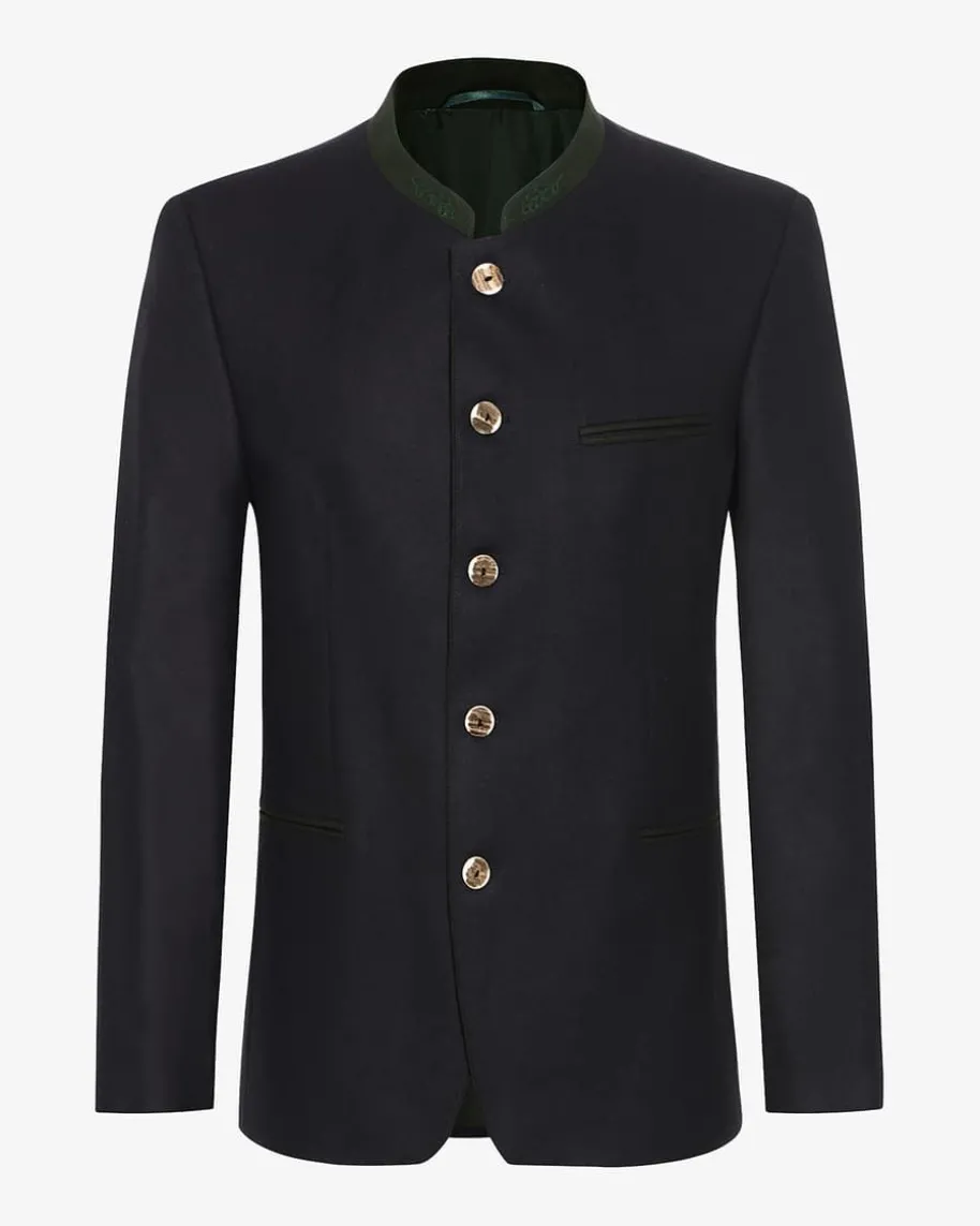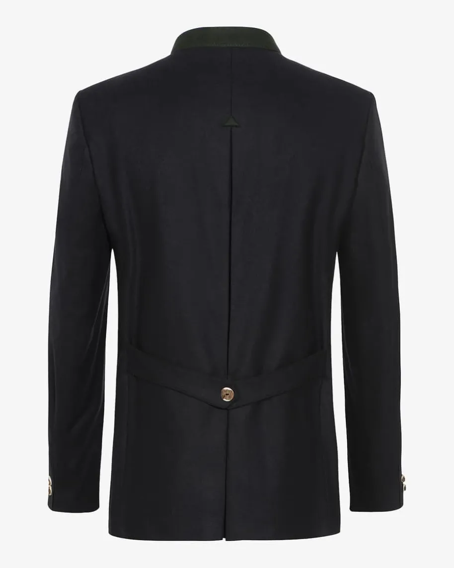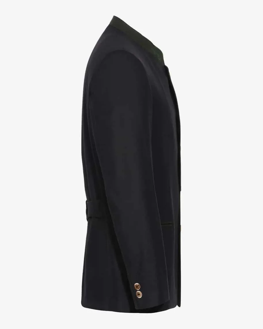 Trachten-Janker für Herren von Lodenfrey in Dunkelblau und Grün. Das Modell mit klassischem Charakter besticht durch zeitlose Details und gerade Passform. Dank der dezenten Schulterwattierung sowie der Kellerfalte mit Zierriegel auf der Rückseite ist für eleganten Sitz und hohen Tragekomfort gesorgt, der durch das edel-changierende Logo-Futter auf der Innenseite mit drei Taschen optimal ergänzt wird. Dunkelgrüne Kontrastpaspeln ergänzen die drei Taschen auf der Außenseite sowie den leichten Stehkragen mit dezenter Stickerei und vollenden neben den rustikalen Hornknöpfen gekonnt die traditionelle Aufmachung.