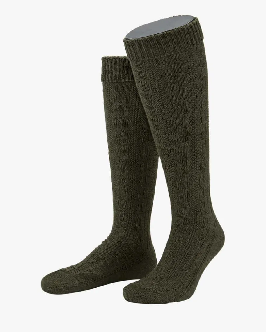 Trachten-Kniestrümpfe für Herren von Lusana in Oliv. Mit traditionellemZopfmuster präsentieren sich die kniehohen Trachtenstrümpfe des österreichischenLabels. Für perfekten Sitz und hohen Tragekomfort sorgen die handgekettelteSpitze sowie die hochwertige Material-Komposition.
