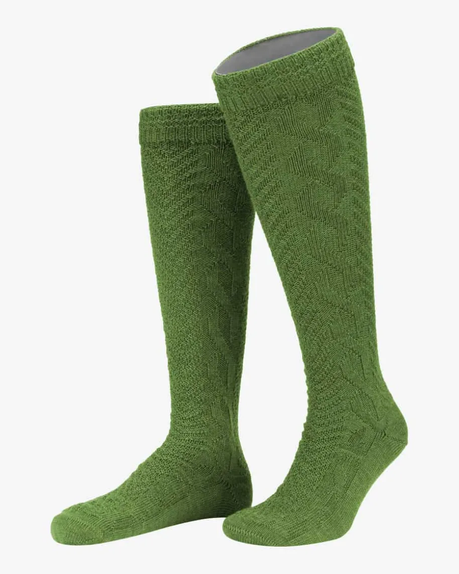 Trachten-Kniestrümpfe für Herren von Luise Steiner in Grün. Mittraditionellem Zopfmuster präsentieren sich die kniehohen Trachtenstrümpfe desösterreichischen Labels. Für perfekten Sitz und hohen Tragekomfort sorgen diehandgekettelte sowie verstärkte Fersen- und Zehenpartie, während der Schurwoll-Mix Ihre Füße auch an kalten Tagen warmhält.