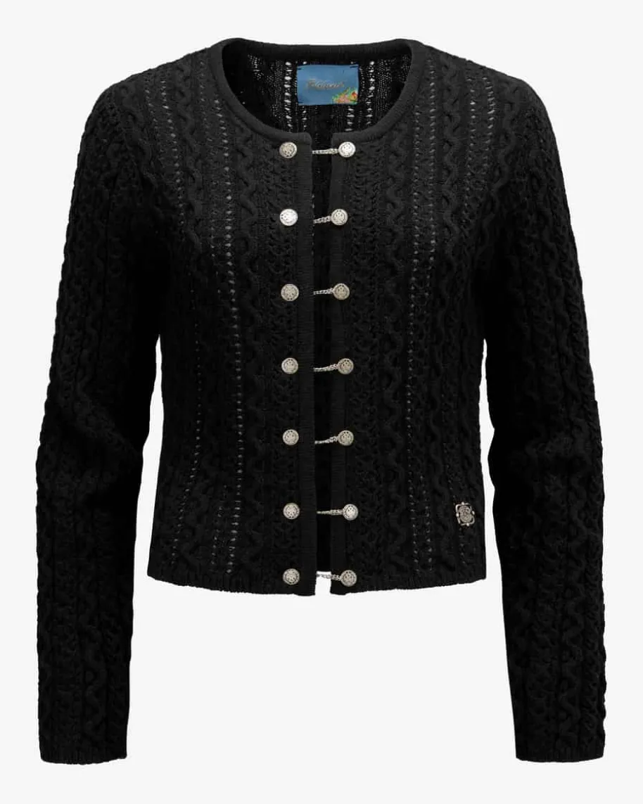 Trachten-Strickjacke für Damen von Edelweiß in Schwarz. Das klassische Strick-Muster sowie Münz-Knöpfe mit Ketten-Details untermalen dietraditionelle Aufmachung des Modells, während die hochwertige Schurwoll-Qualitätdas Gesamtbild gekonnt vollendet.
