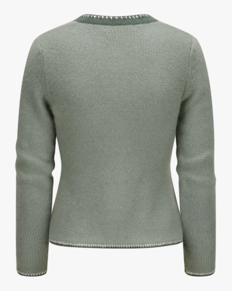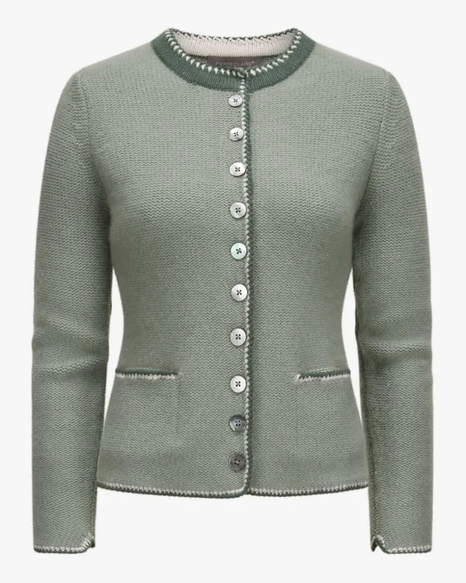 Trachtenstrickjacke für Damen von Pierre Claire in Salbei, Graugrün und Creme.Die hochwertige Merino-Cashmere-Qualität verleiht dem klassischen Modell eineunverwechselbare Haptik, während die Perlmuttknöpfe sowie kontrastierendeElemente einen traditionellen Look mit moderner Note schaffen.