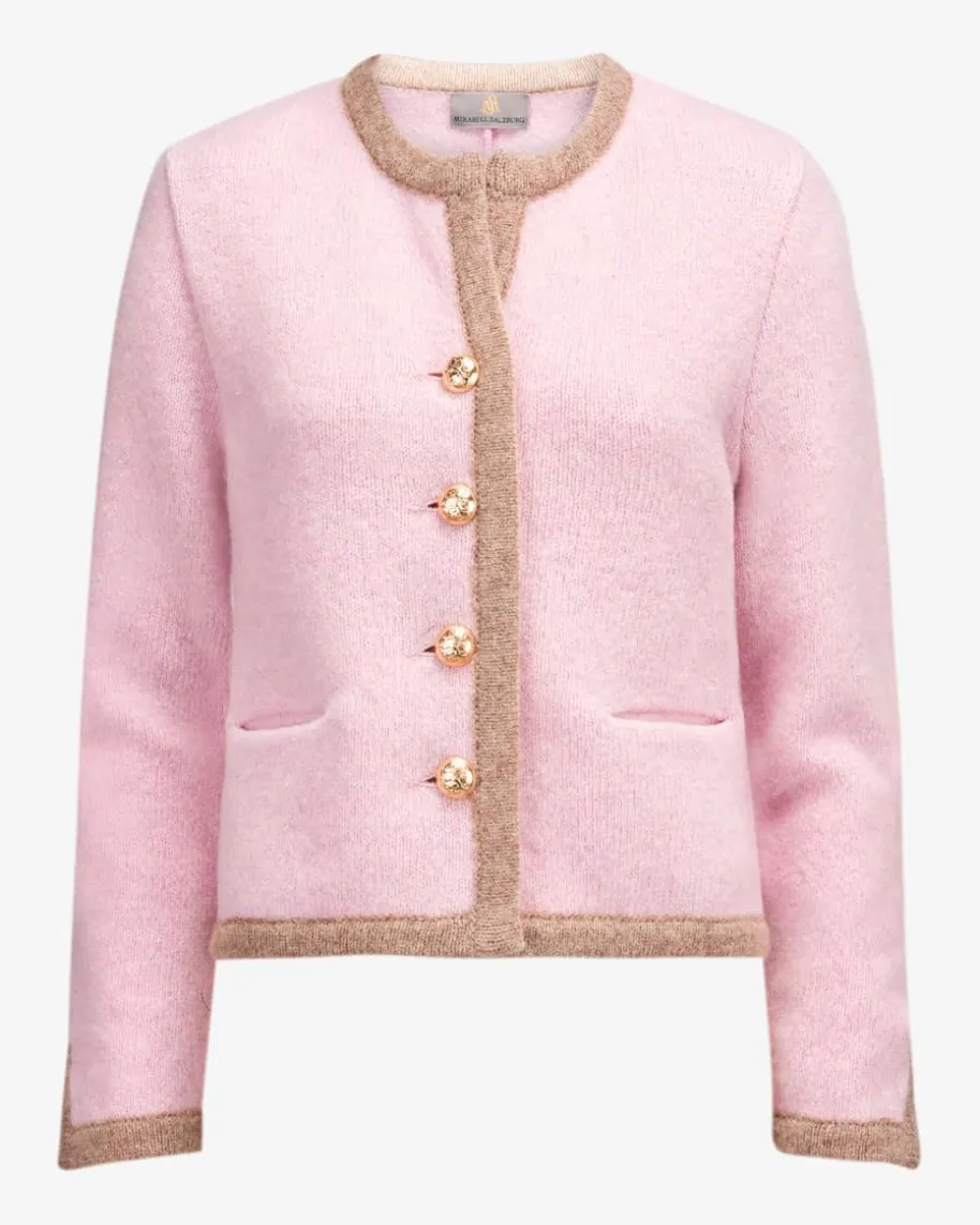 Trachten-Strickjacke für Damen von Mirabell in Rosé und Beige. Diehochwertige Schurwoll-Qualität verleiht dem klassischen Modell eineunverwechselbare Haptik, während goldfarbene Wappenknöpfe sowie kontrastierendeElemente einen traditionellen Look mit moderner Note schaffen.