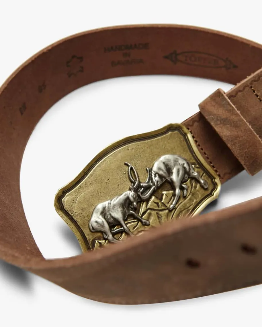 Trachtengürtel für Herren von Töpfer in Hellbraun. Handgefertigt in Bayern undin softer Leder-Qualität präsentiert sich der rustikale Gürtel als maskulinerBegleiter zur Lederhose, während die markante Metall-Schließe mit erhabenemSteinbock-Motiv eine traditionelle Note verleiht.