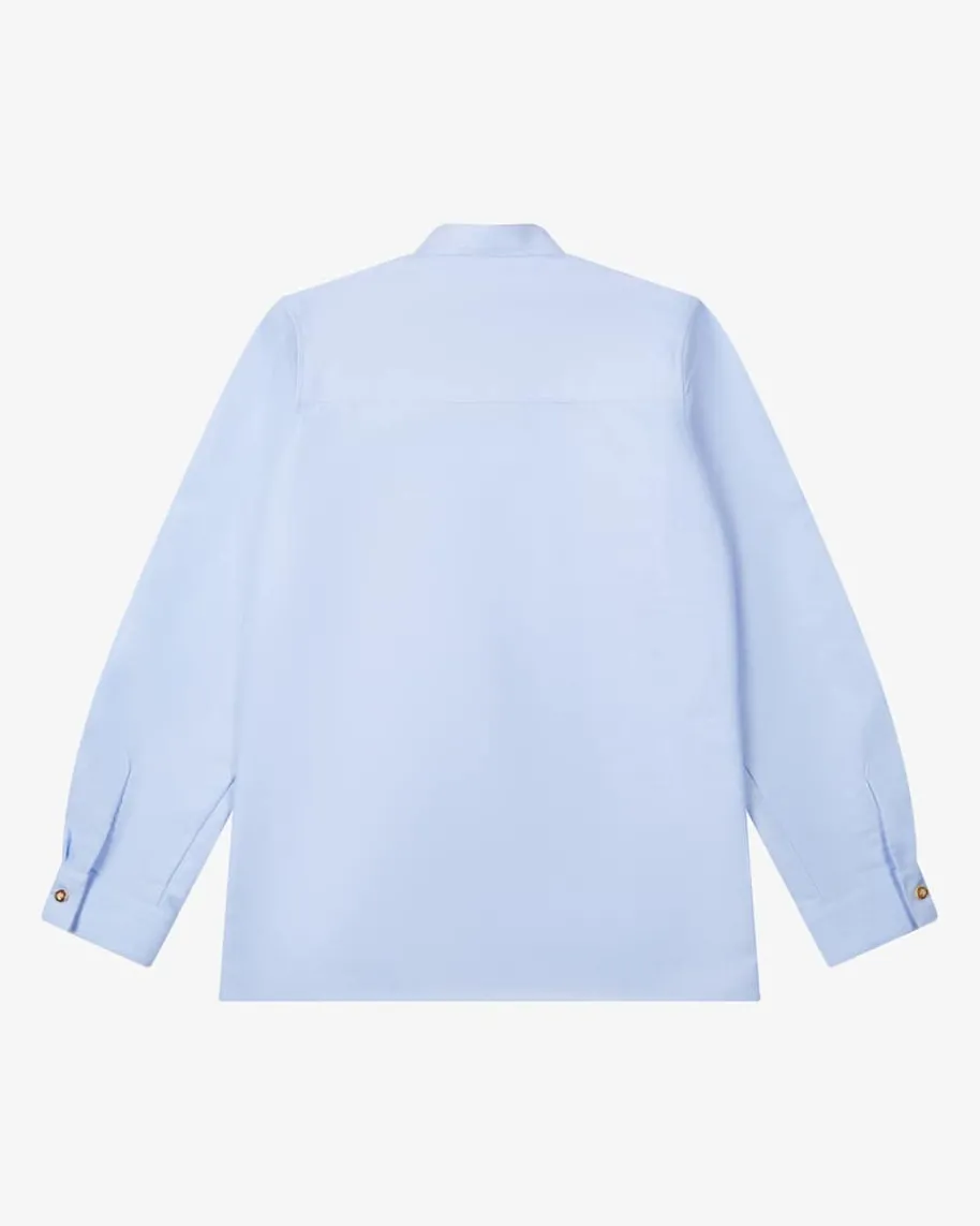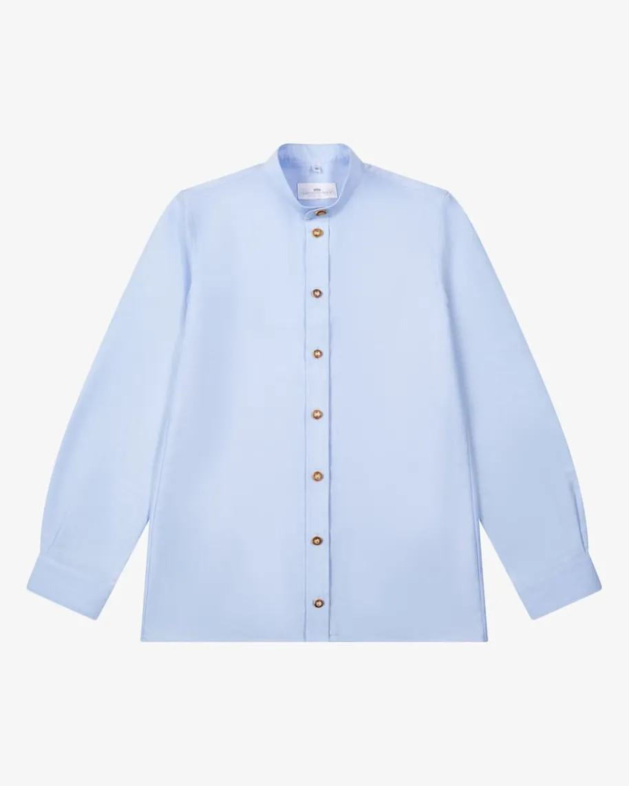 Trachtenhemd für Jungen von LODENFREY in Hellblau. Das Modell aus angenehmerBaumwolle überzeugt dank dezent strukturierter Qualität, Knöpfen in Horn-Optiksowie dem Stehkragen als stilvoller Blickfang für modische Mini-Trachten-Outfits.