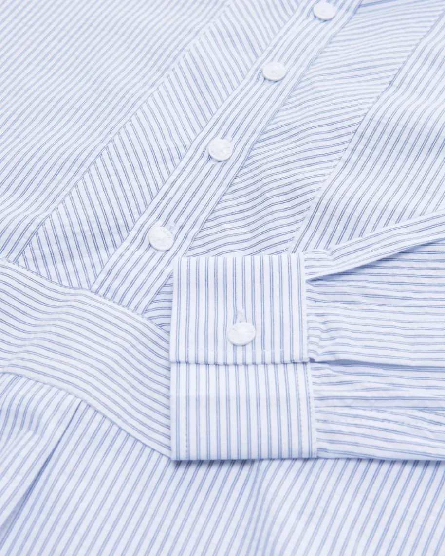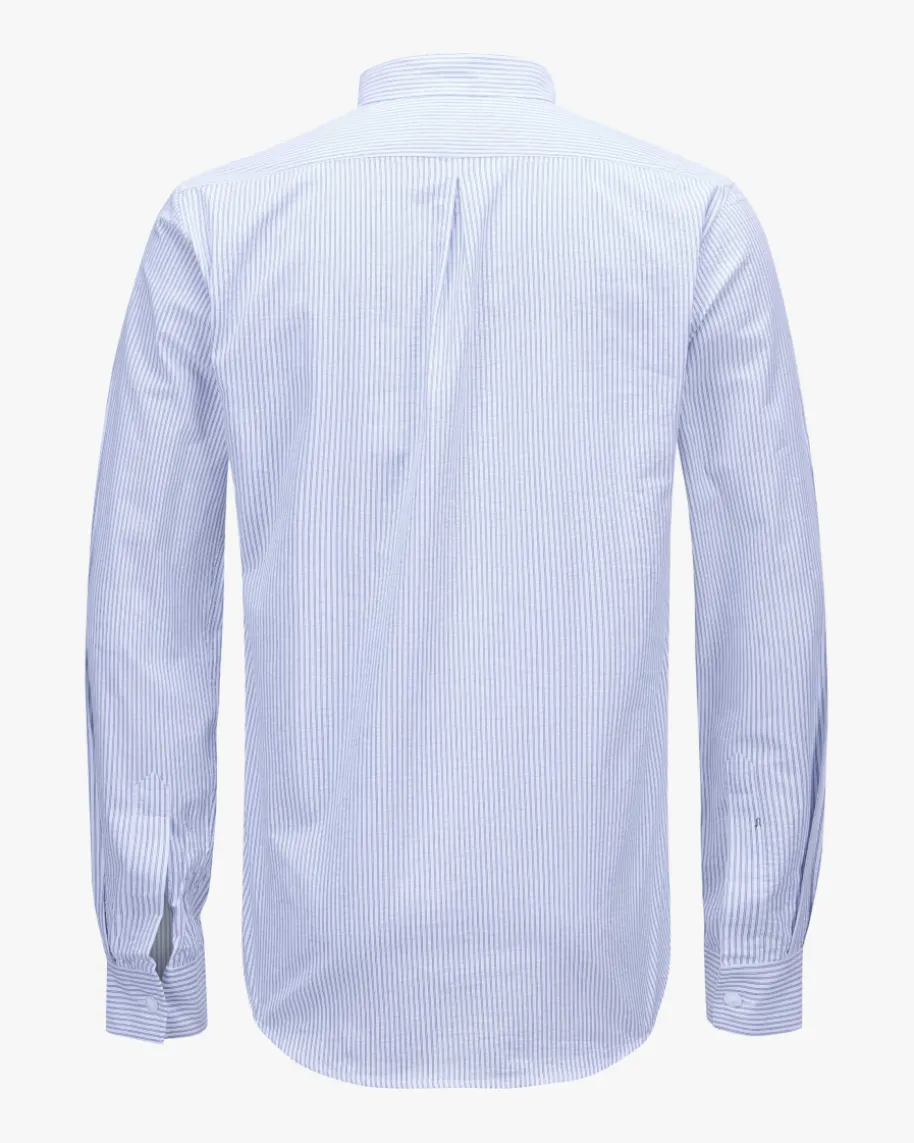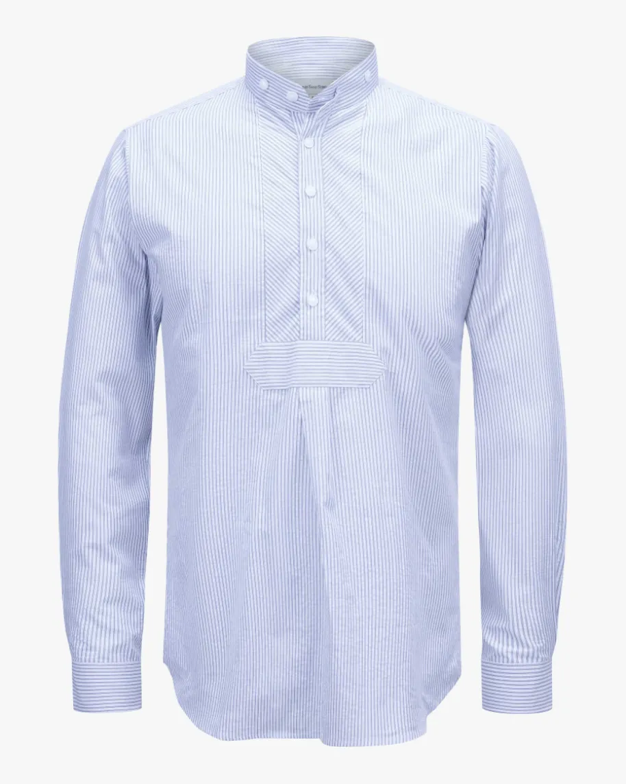 Trachtenhemd Schmal für Herren von Hund Sans scho in Weiß und Dunkelblau. Diebeiden Münchner Freunde gründeten ihr Label um zeitgemäße Trachtenhemden mit demgewissen Etwas zu entwerfen, die leicht zu tragen sind und auf jedemOktoberfest- oder Volksfest-Besuch hohen Tragekomfort bieten. Dieses schmalgeschnittene Sommer-Pfoad-Modell besticht durch die dezente Seersucker-Aufmachung mit einem leichten Tragegefühl und verleiht zusammen mit demStreifenmuster einen modernen Charakter.