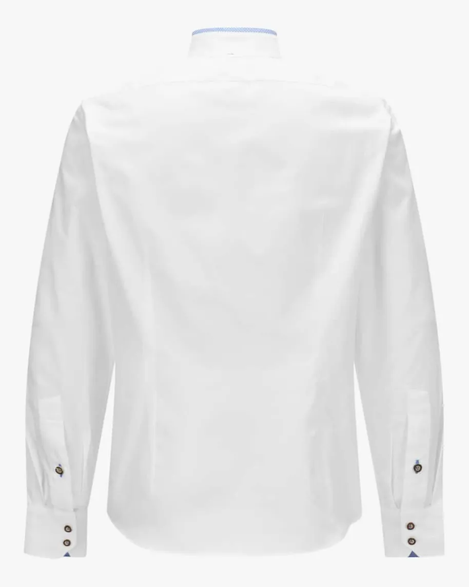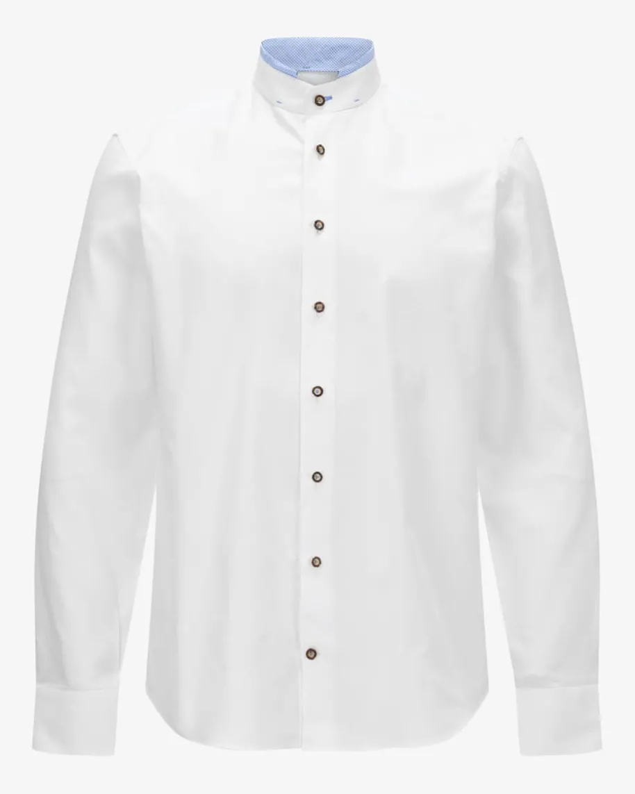 Trachtenhemd Slim Fit für Herren von van Laack in Weiß und Hellblau. RustikaleHornknöpfe, ein dezenter Stehkragen sowie der tonale Ausputz zeichnen dasTrachten-Modell aus, während die schmale Passform sowie die Baumwoll-Qualitätdem Look einen traditionellen Charme verleihen.