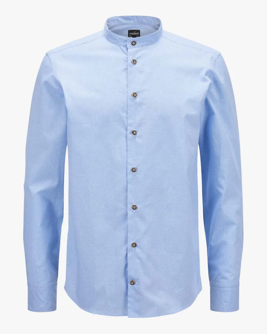 Trachtenhemd Tailor Fit für Herren von Van Laack in Hellblau und Weiß. Dasdeutsche Traditionshaus steht seit 1881 für Maßhemden und hochwertige Blusen –elegant und detailverliebt. Rustikale Hornknöpfe und ein dezenter Stehkragenzeichnen das Trachten-Modell aus, während die taillierte Passform sowie dieBaumwoll-Qualität dem Look einen traditionellen Charme verleihen.