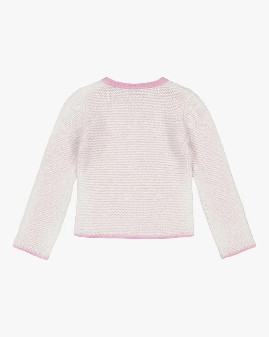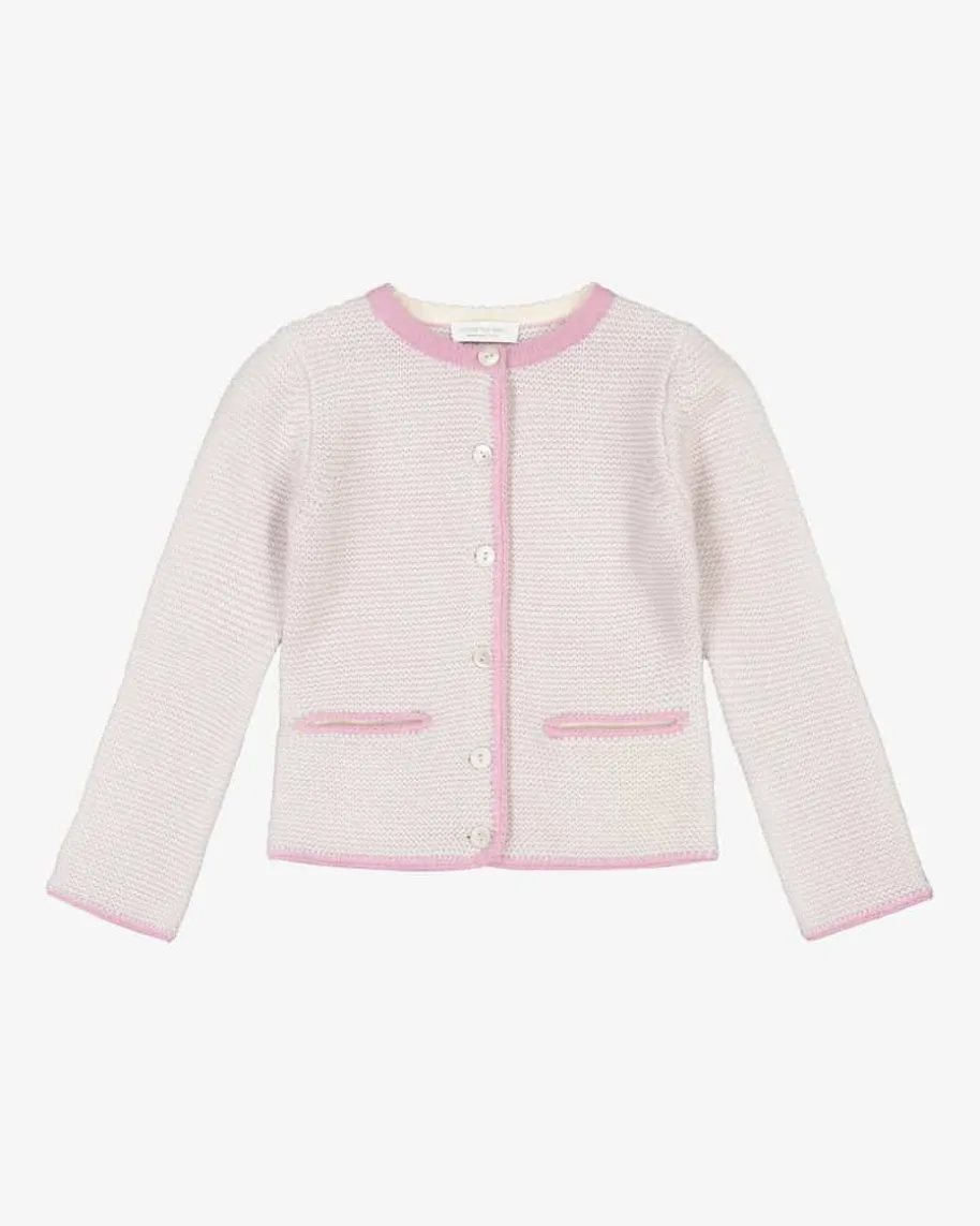 Mädchen-Trachtenstrickjacke von LODENFREY in Puder und Rosa. DieStrickjacke aus feiner Woll-Cashmere-Qualität besticht durch besonders angenehmeTragemomente sowie die traditionelle Aufmachung. Raffinierte Kontrast-Paspelierungen und das klassische Strickmuster verleihen dem taillierten Modelleine niedlich, rustikale Note.