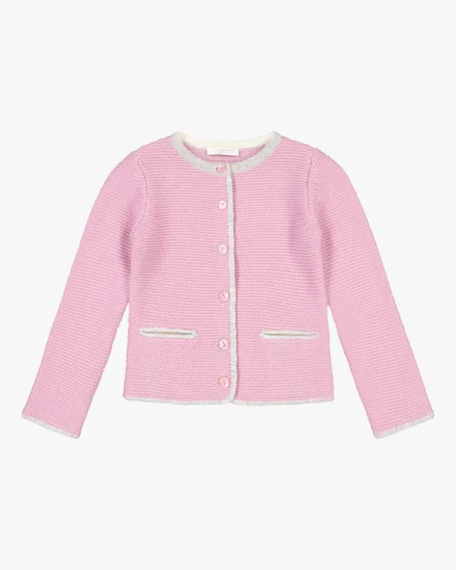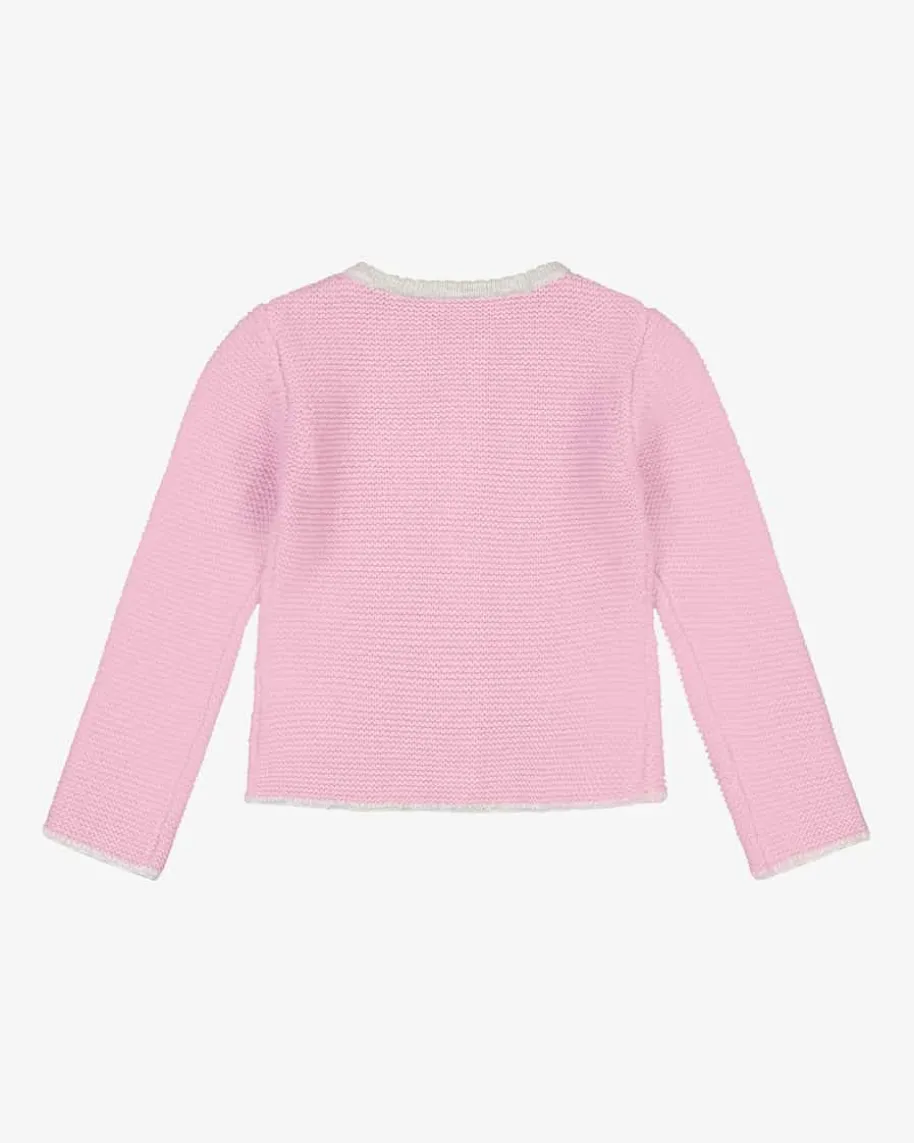 Mädchen-Trachtenstrickjacke von LODENFREY in Rosa und Hellgrau. DieStrickjacke aus feiner Woll-Cashmere-Qualität besticht durch besonders angenehmeTragemomente sowie die traditionelle Aufmachung. Raffinierte Kontrast-Paspelierungen und das klassische Strickmuster verleihen dem taillierten Modelleine niedlich, rustikale Note.