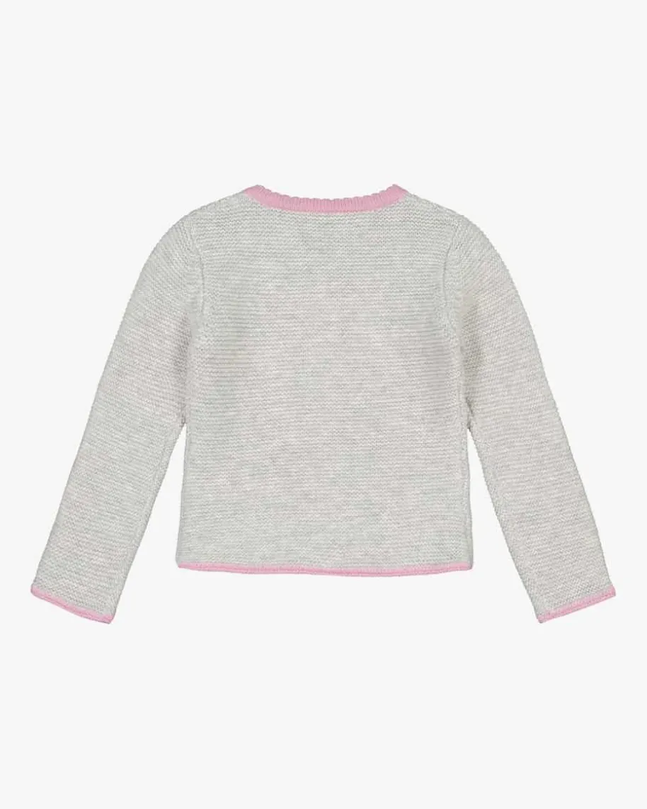 Mädchen-Trachtenstrickjacke von LODENFREY in Hellgrau und Rosa. DieStrickjacke aus feiner Woll-Cashmere-Qualität besticht durch besonders angenehmeTragemomente sowie die traditionelle Aufmachung. Raffinierte Kontrast-Paspelierungen und das klassische Strickmuster verleihen dem taillierten Modelleine niedlich, rustikale Note.