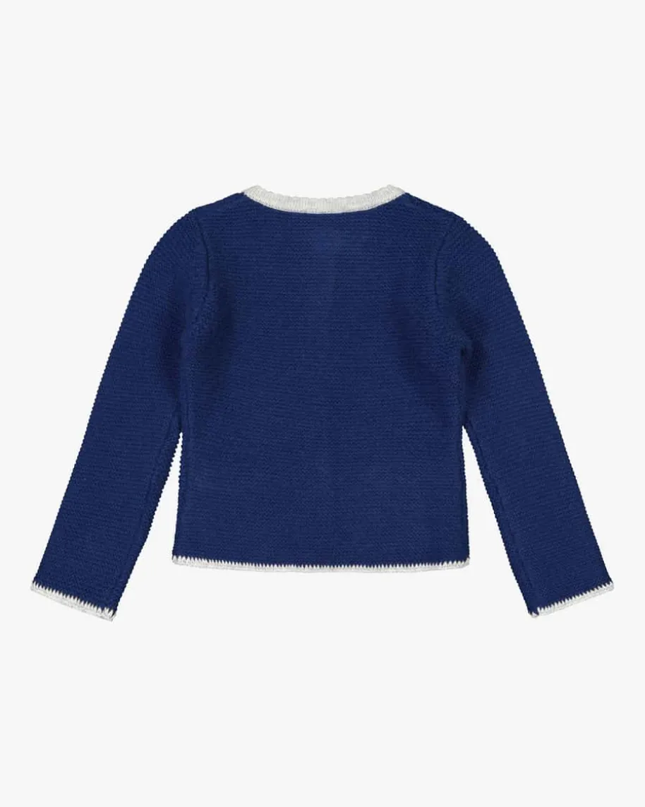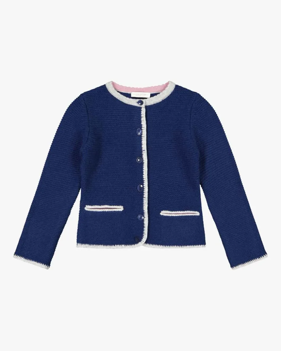 Mädchen-Trachtenstrickjacke von LODENFREY in Navy und Hellgrau. DieStrickjacke aus feiner Woll-Cashmere-Qualität besticht durch besonders angenehmeTragemomente sowie die traditionelle Aufmachung. Raffinierte Kontrast-Paspelierungen und das klassische Strickmuster verleihen dem taillierten Modelleine niedlich, rustikale Note.