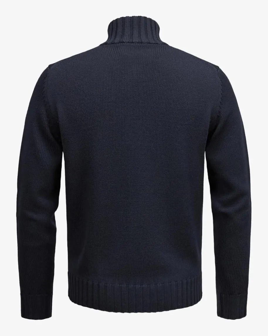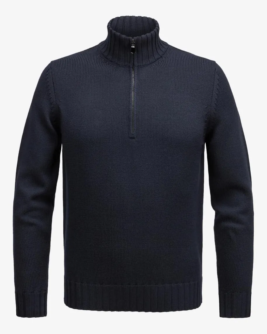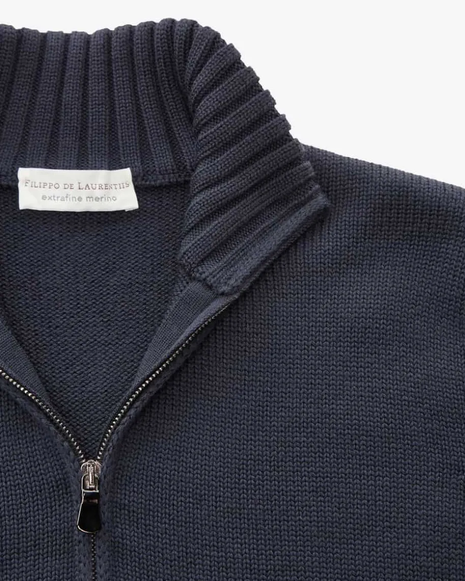 Troyer für Herren von Filippo de Laurentiis in Navy. Dank der Verwendung vonextrafeiner Merinowolle garantiert das Modell angenehmen Tragekomfort, währenddas klassische Strick-Design mit markanten Rippstrick-Bündchen einenhochwertigen und maskulinen Begleiter für Ihre Herbst-Winter-Garderobe kreiert.