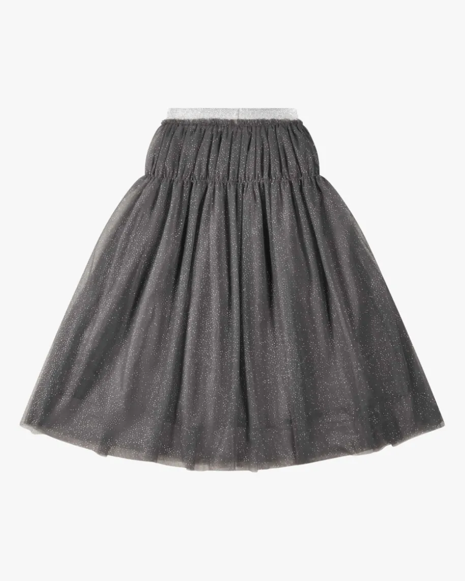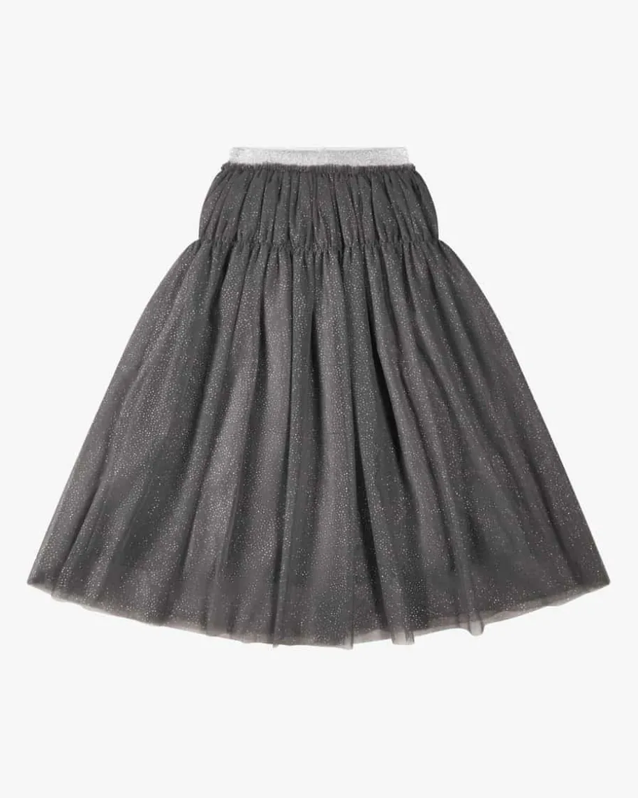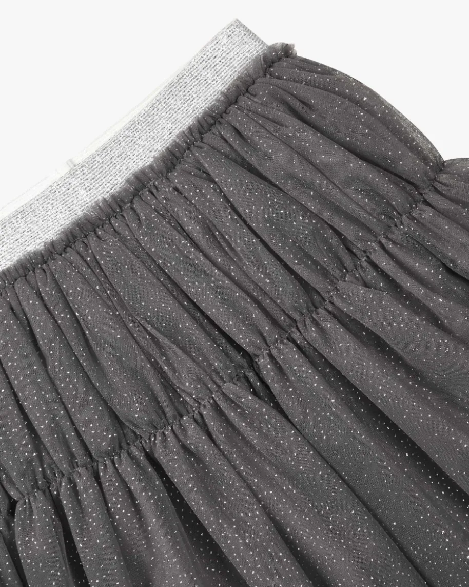 Tüllrock für Mädchen von Il Gufo in Dunkelgrau und Silber. Das Modell punktetdank ausgestellter Passform und semi-transparenter Optik in mädchenhafterAufmachung, während die Allover-Glitzer-Pünktchen einen süßen Begleiter fürmodische Looks schaffen.