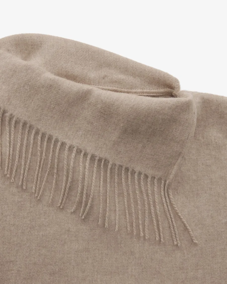 Turtla Poncho-Tuch für Damen von By Malene Birger in Beige. Ein wärmenderKragen-Ersatz mit Poncho-Charakter – Dank der hochwertigen Woll-Verarbeitungbesticht das Modell mit weicher Haptik, während der raffinierte Umlegekragen undFransen-Details einen originellen Country-Style kreieren.