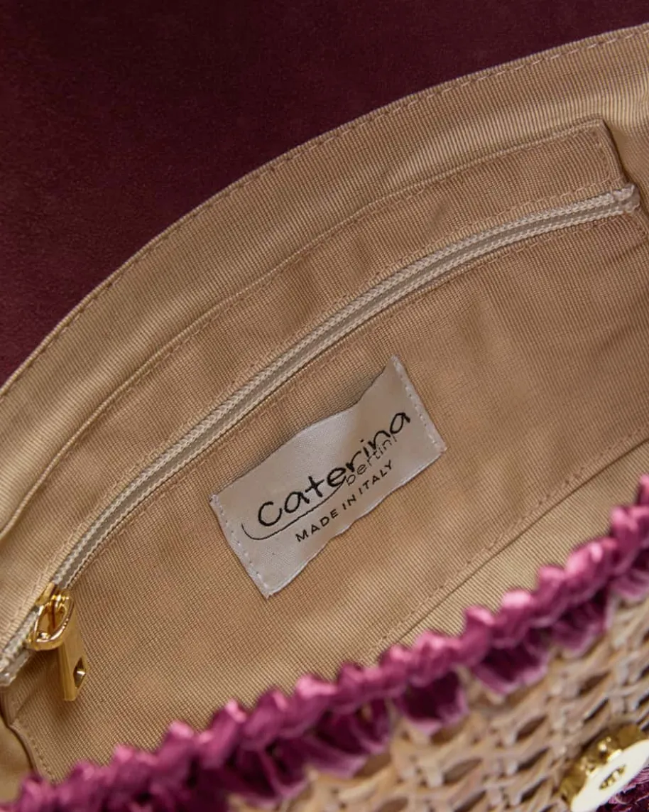 Umhängetasche von Caterina Bertini in Natur und Bordeaux. Made in Italy – Das1925gegründete Label hat bereits damals angefangen sich auf geflochtene Produkte zuspezialisieren und begeistert heutzutage mit hochwertiger Handwerkskunst, dankwelcher jedes Design zu einem Unikat wird. Diese Tasche begeistert incharakteristischer Wiener-Geflecht Aufmachung, während der Kettenträger denletzten Schliff verleiht.
