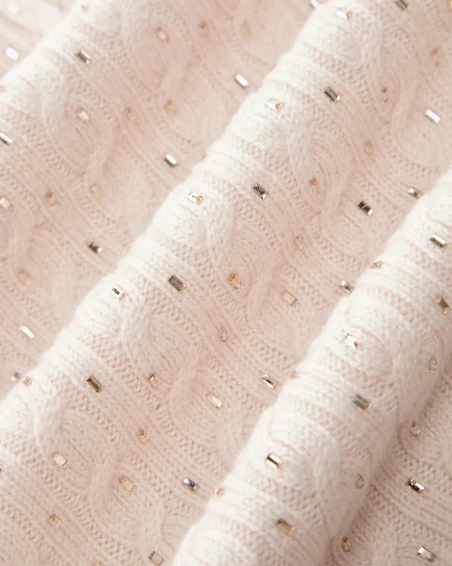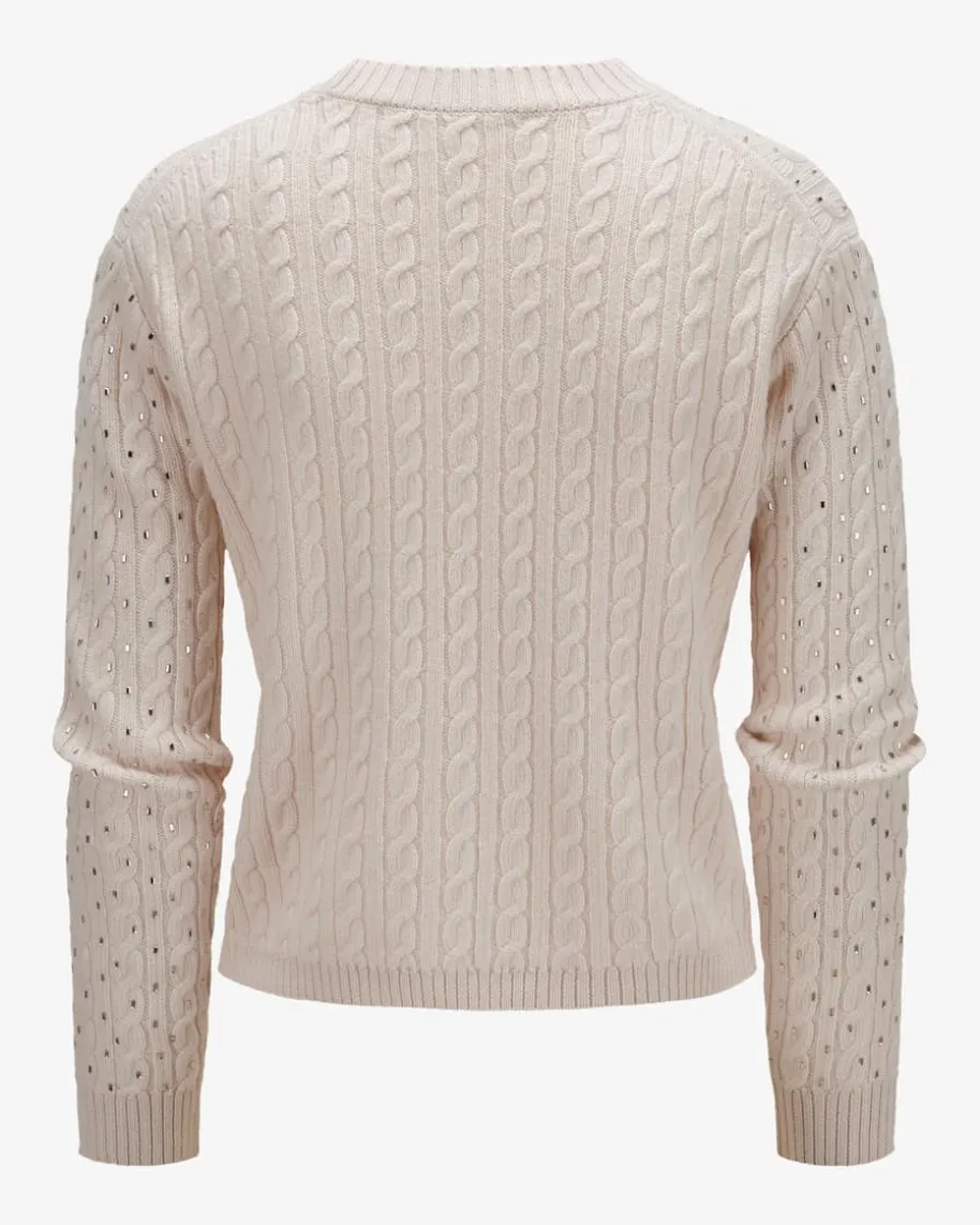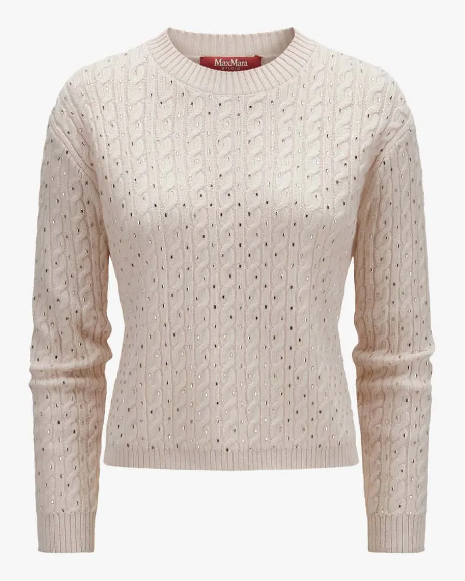 Ussuri Pullover für Damen von Max Mara Studio in Beige und Gold. Das kastiggeschnittene Modell überzeugt dank der Verwendung von reiner Wolle mit einerweichen Haptik, während das Zopfstrickmuster durch die rechteckigenSchmuckstein-Applikationen zu einem stilvollen Hingucker avanciert.