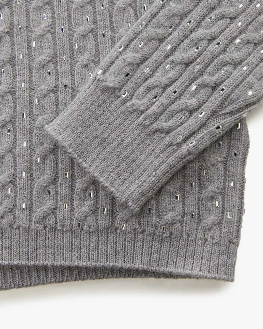 Ussuri Pullover für Damen von Max Mara Studio in Grau und Silber. Das kastiggeschnittene Modell überzeugt dank der Verwendung von reiner Wolle mit einerweichen Haptik, während das Zopfstrickmuster durch die rechteckigenSchmuckstein-Applikationen zu einem stilvollen Hingucker avanciert.