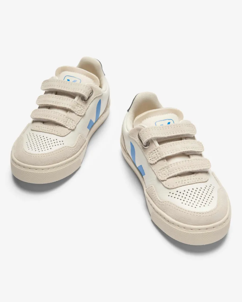 V-90 Sneaker für Kinder von Veja in Weiß, Hellgrau und Blau. Nachhaltige undethische Herstellung stehen für das französische Label im Vordergrund. DasModell begeistert dank der edlen Leder-Qualität in sportiver Aufmachung, währendkontrastierende Logo-Details das Label charakteristisch widerspiegeln.