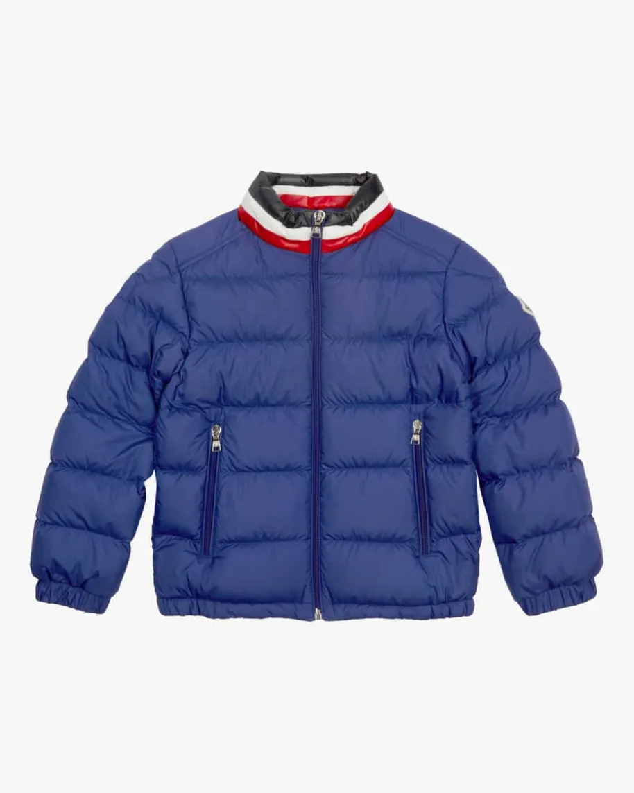 Vashiti Daunenjacke für Jungen von Moncler Enfant in Royal. Das Modell bestichtmit klassischem Steppmuster in mattem, leicht schimmerndem Finish, während diehochwertige Daunen-Feder-Füllung eine optimale Wärmeisolierung verspricht. Zudemrunden die Kontraststreifen am Kragen den Look sportiv ab.