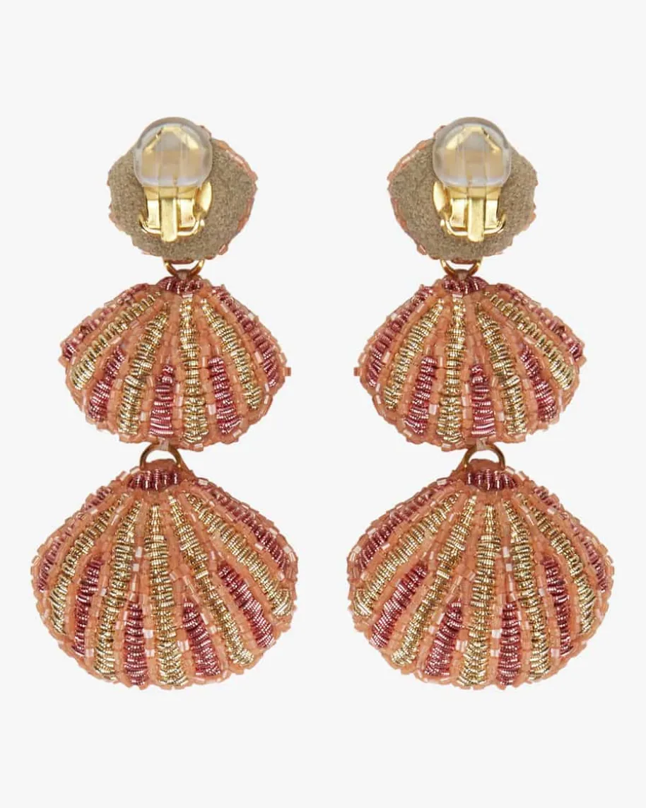 Venus Clip-Ohrringe von Olivia Dar in Lachs, Apricot und Gold. Diesesextravagante Schmuckstück avanciert dank changierender Schmuckperlen-Applikationen zu einem besonderen Eyecatcher, der jedem Outfit einen HauchRaffinesse verleiht.