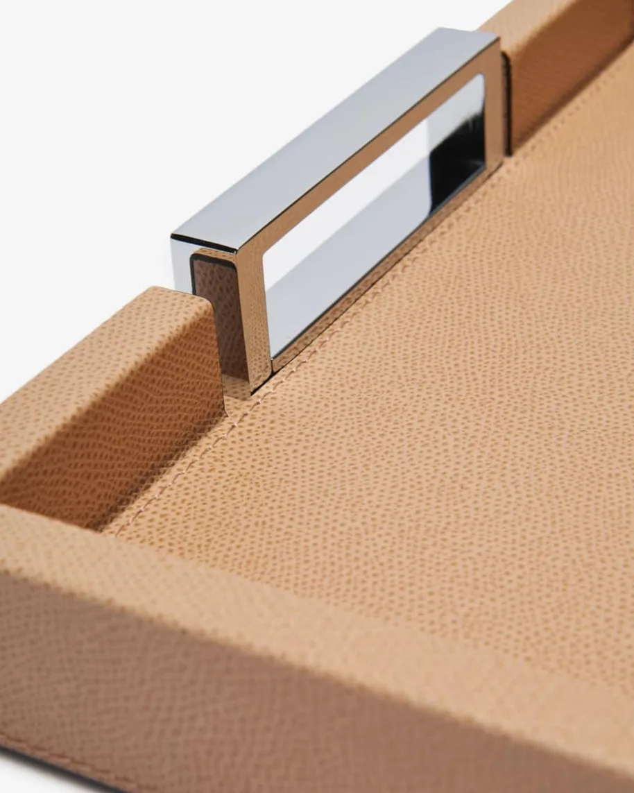 Victor Leder-Tablett Small von Giobagnara in Cappuccino. Handmade in Italy –Feinste Leder-Verarbeitungen zeichnen die italienische Luxusmarke aus. Auchdiese praktische Ablage besticht dank der Kombination aus dem edlen Kalbsleder-Bezug sowie den stilvollen Metall-Henkeln in luxuriöser Aufmachung und bietetidealen Platz für Kleinigkeiten oder eignet sich auch als Serviertablett.